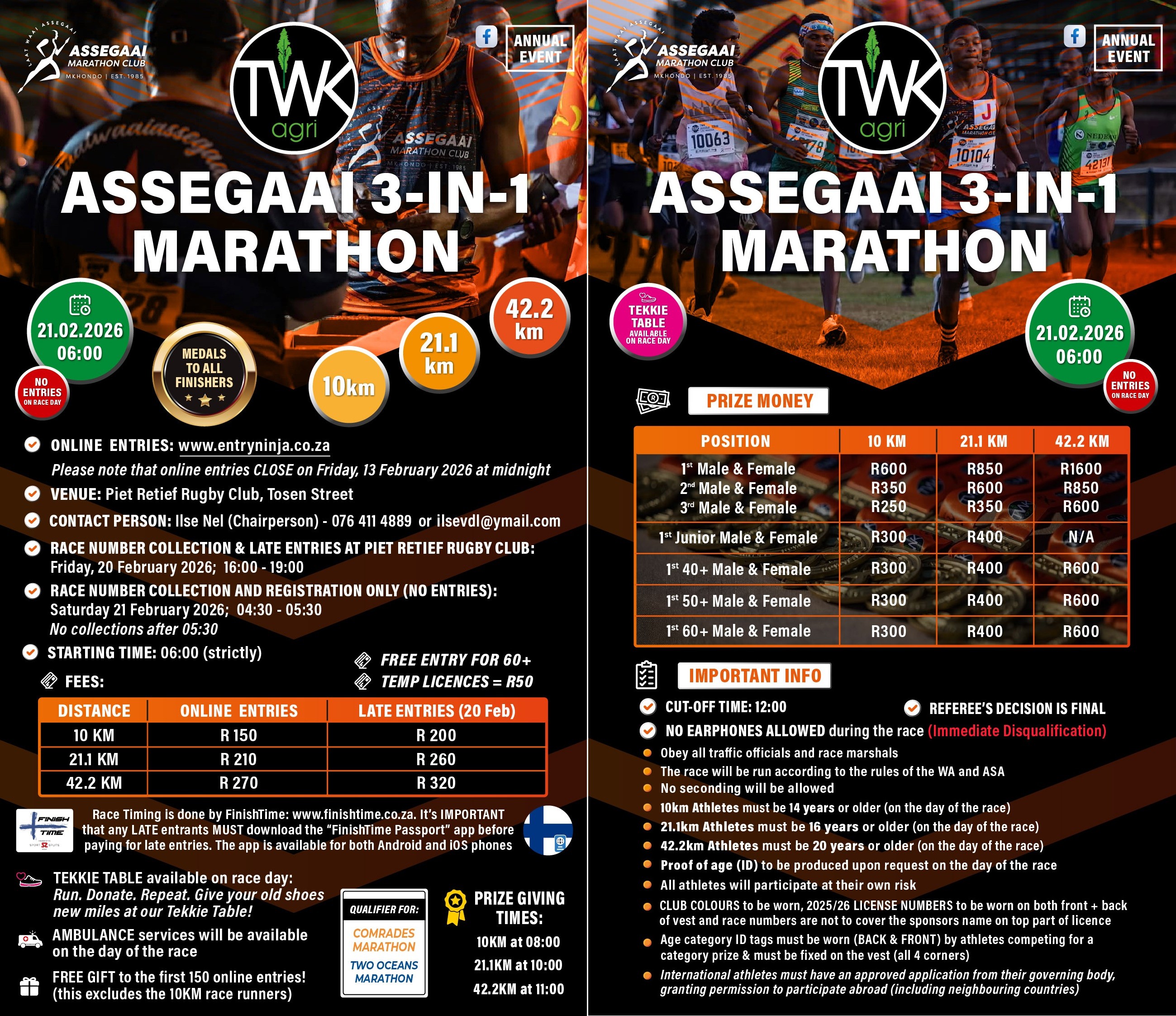 The 2026 TWK Assegaai 3-in-1 Marathon will take place 21 Feb 2026 from 06h00 at the Piet Retief Rugby Club, Tosen St in eMkhondo, Mpumalanga. Distances available include 42.2km, 21.1km and 10km races.
