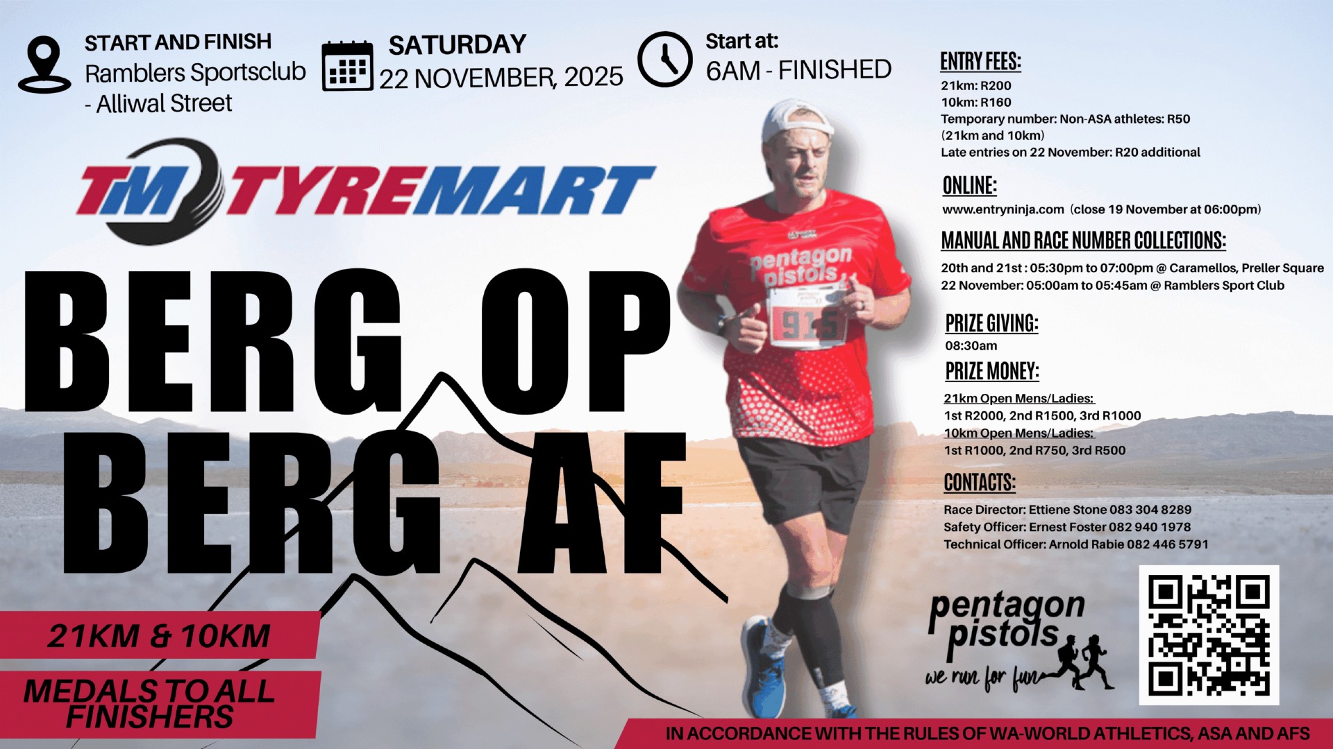 The 2025 Pentagon Pistols Berg-op-Berg-af will take place 22 Nov 2025 from 06h00 at the Ramblers Sports Club, 52 Aliwal St in Bloemfontein, Free State. Distances available include 21.1km and 10km races.
