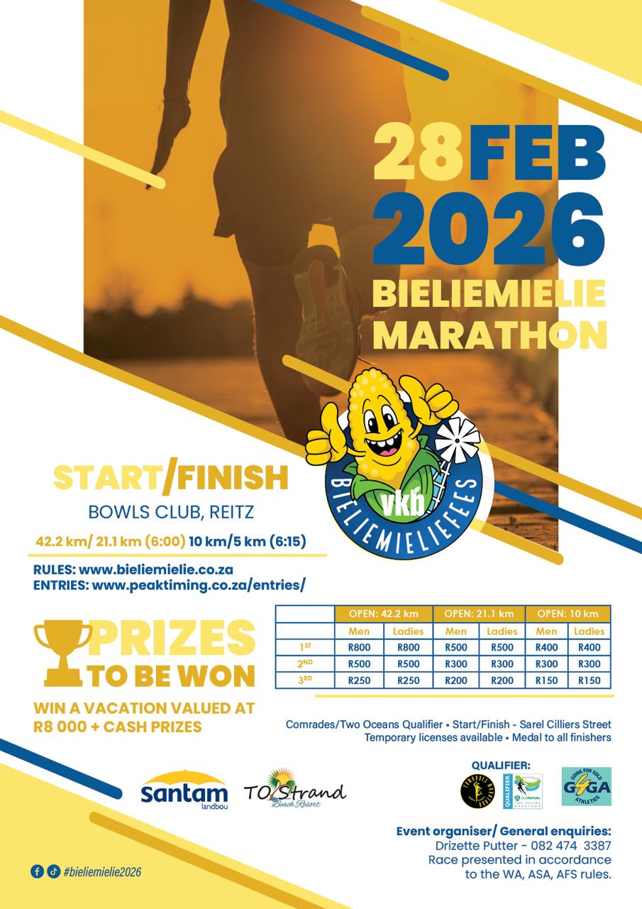 The 2026 Santam Bieliemielie Marathon will take place Saturday, 28 February 2026 from 06h00 at the Bowling Club, Sarel Cilliers Street in Reitz, Free State. Distances available include 42.2km, 21.1km, 10km and 5km races.