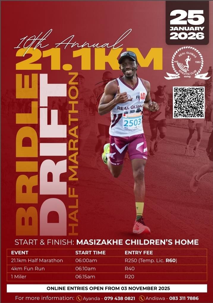 The 2026 BRIDLE DRIFT Half Marathon will take place 25 Jan 2026 from 06h00 at the Masizakhe Children's Home, Saule Road in Mdantsane, Eastern Cape. Distances available include 21.1km, 4km and 1.6km races.