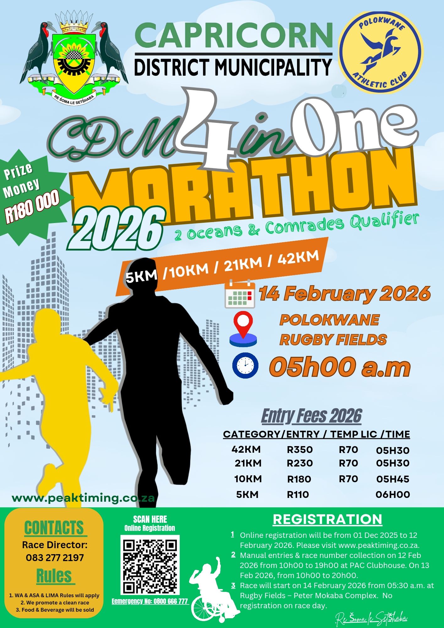 The 2026 CDM 4-in-1 Marathon will take place 14 Feb 2026 from 05h30 at the Old Peter Mokaba Stadium in Polokwane, Limpopo. Distances available include 42.2km, 21.1km, 10km and 5km races.