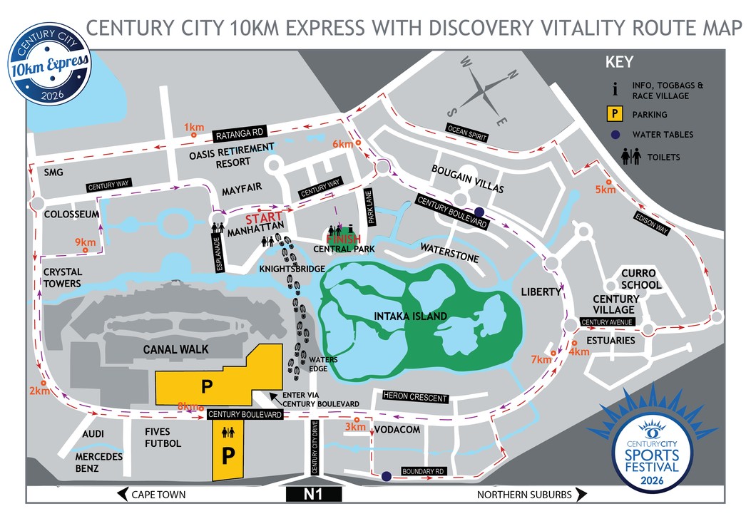 The 2026 FinishTime & Century City Express with Discovery Vitality will take place Saturday, 28 February 2026 from 07h00 starting at Century Way, Century City and finishing at Central Park, Century City in Cape Town, Western Cape. Distances available include 10km and 5km races.
