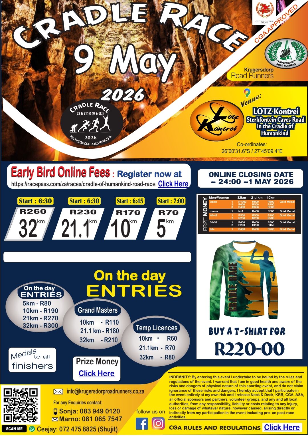 The 2026 Cradle of Humankind Race will take place Saturday, 9 May 2026 from 06h30 at the LOTZ Kontrei, Sterkfontein Caves Road, Cradle of Human Kind in Krugersdorp, Gauteng. Distances available include 32km, 21.1km, 10km and 5km races.