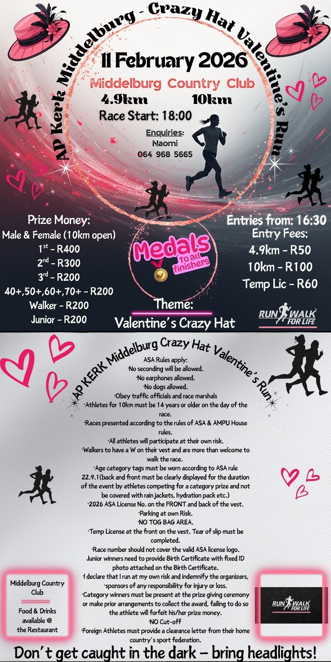 The 2026 Crazy Hat Valentine's Run will take place Wednesday, 11 February 2026 from 18h00 at the Middelburg Country Club in Middelburg, Mpumalanga. Distances available include 10km and 4.9km races.