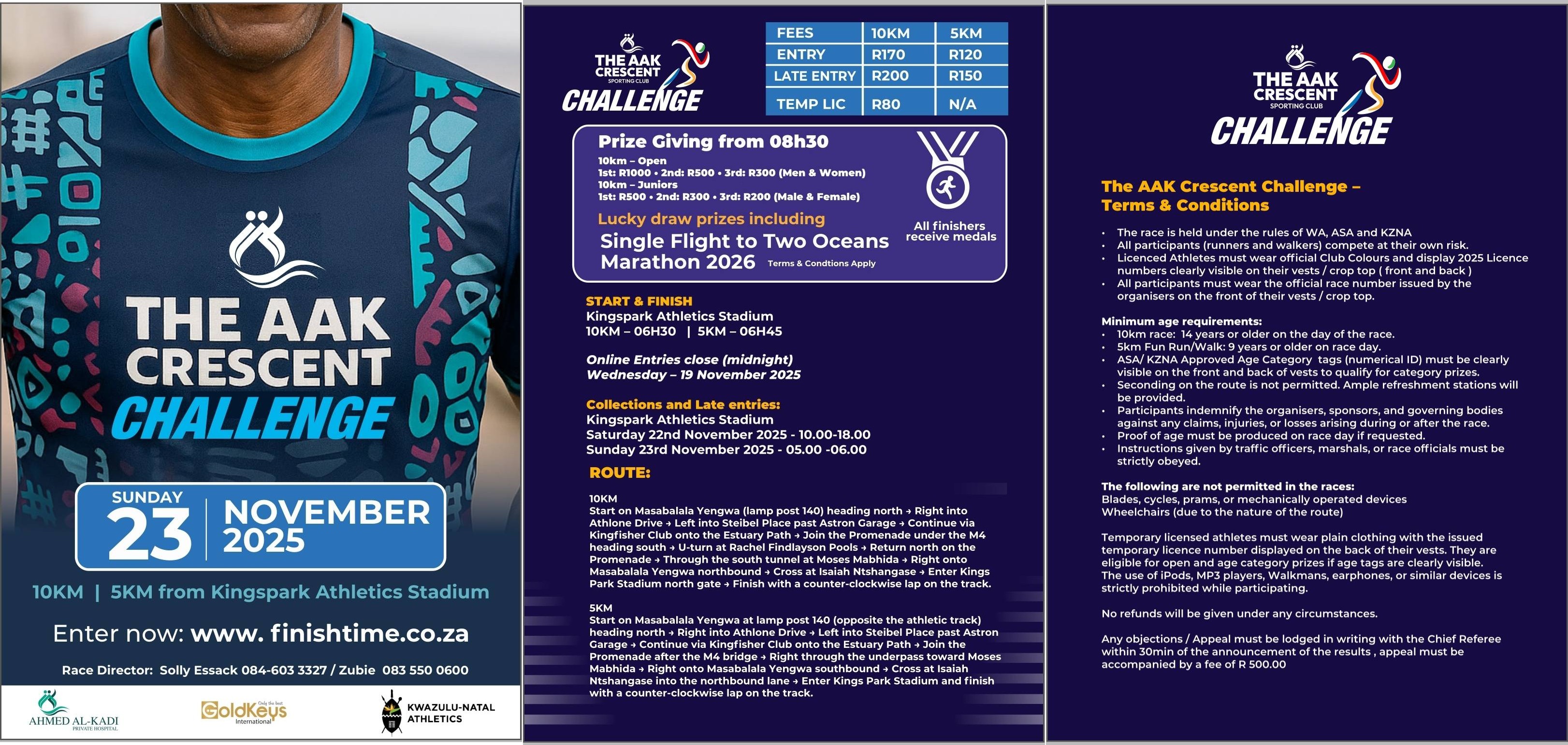 The 2025 The AAK Crescent Challenge will take place 23 Nov 2025 from 06h30 at the Kings Park Athletics Stadium in Durban, KwaZulu Natal. Distances available include 10km and 5km races.