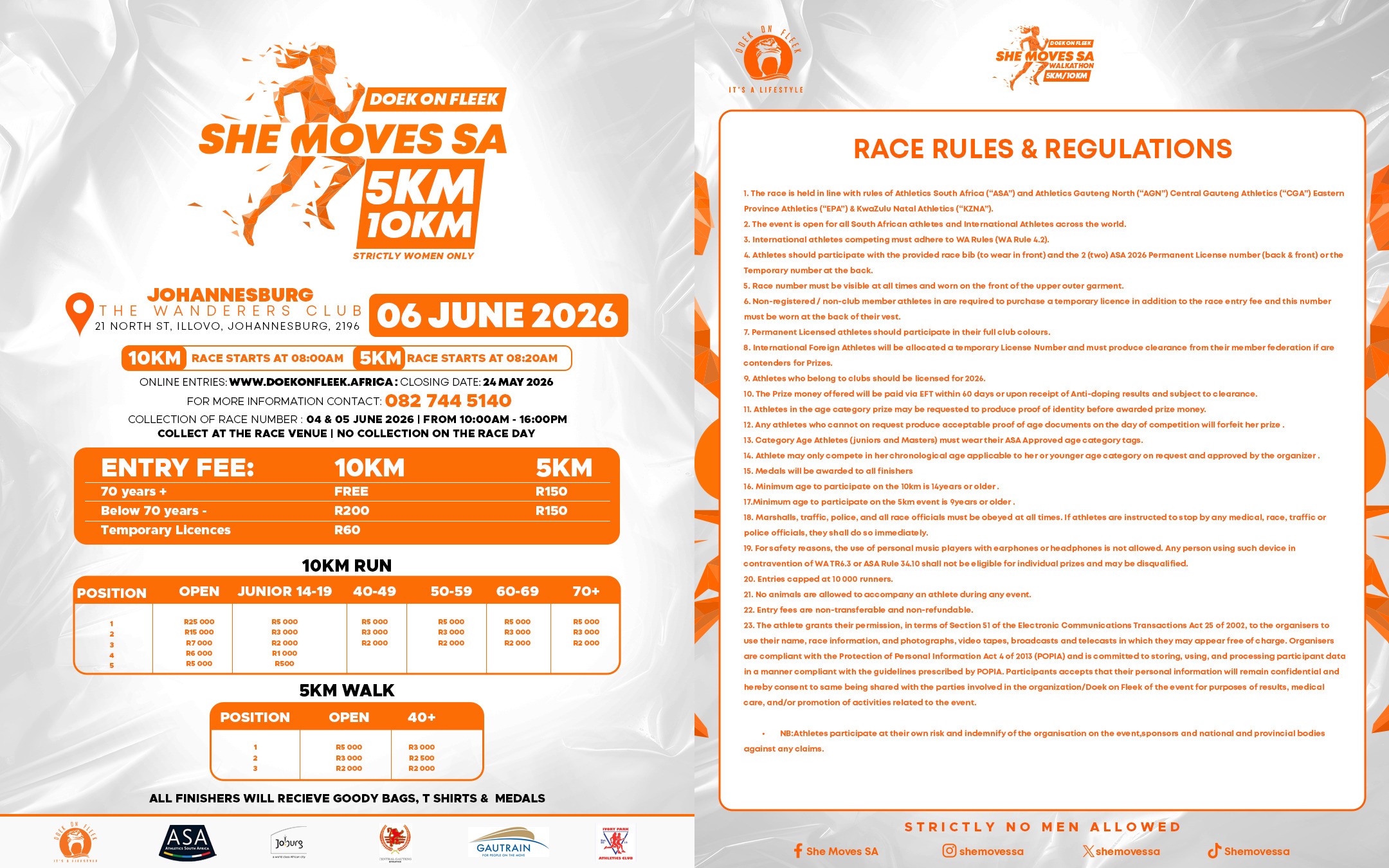 The 2026 Doek on Fleek - She Moves SA JHB will take place Saturday, 6 June 2026 from 08h00 at the The Wanderers Club, 21 North St, Illovo in Johannesburg, Gauteng. Distances available include 10km and 5km races.