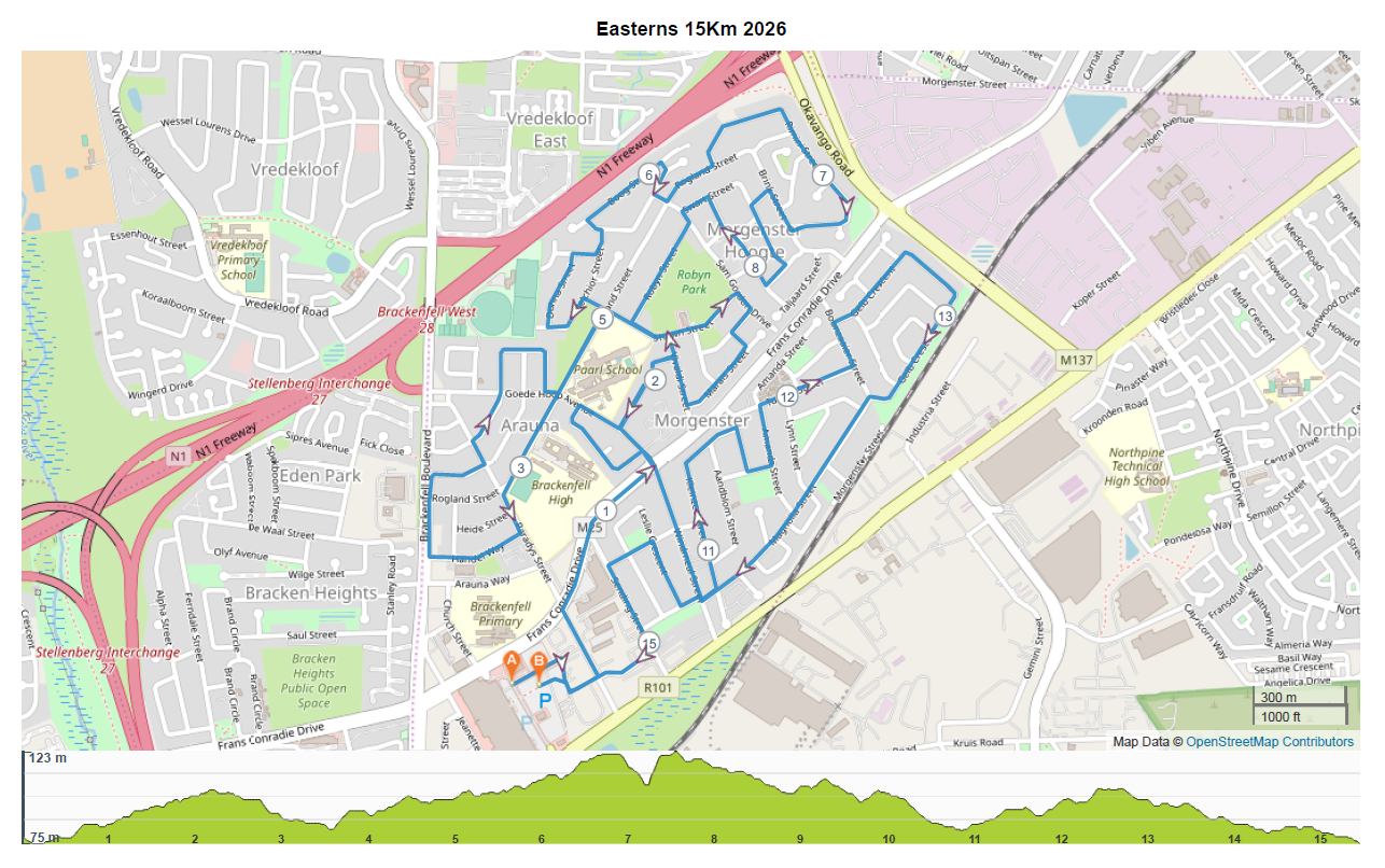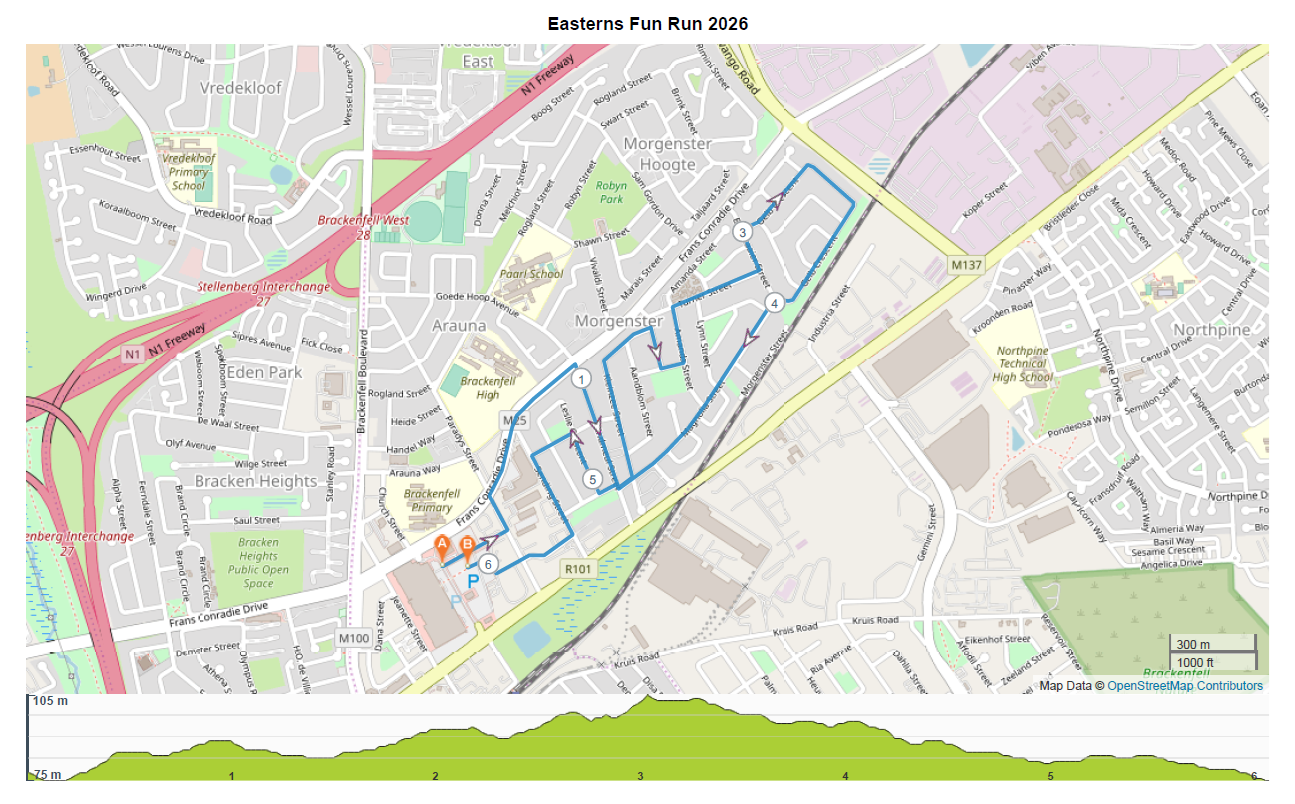 The 2026 Easterns 15km Road Race will take place Saturday, 16 May 2026 from 07h00 at the Brackenfell Hyper, Old Paarl Road in Brackenfell, Western Cape. Distances available include 15km and 5.7km races.