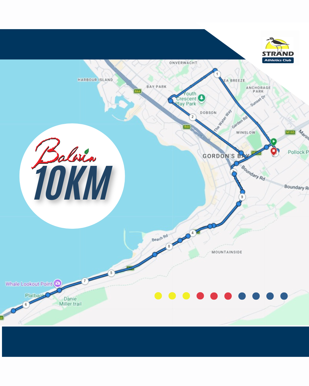 The Strand Athletics Club, with the assistance of the Hangklip Athletics Club, proudly presents the iconic point‑to‑point race from Kleinmond to Gordon’s Bay along the scenic coastal road past Betty’s Bay, Pringle Bay, Rooi Els and Kogel Bay. A 10 km run starting and finishing in Gordon’s Bay has been added.