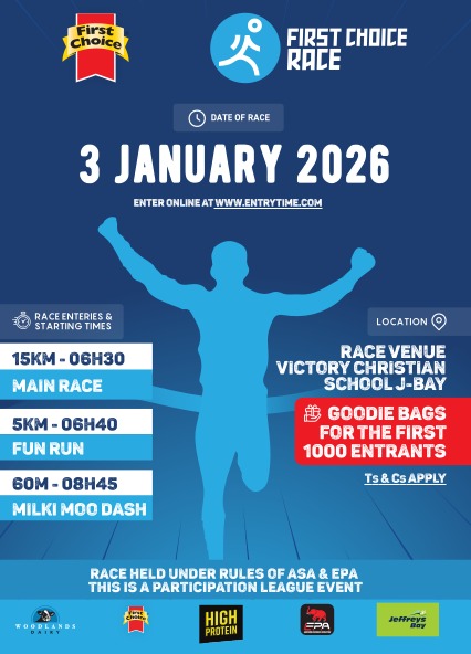 The 2026 First Choice Race will take place 3 Jan 2026 from 06h30 at the Victory Christian School in Jeffrey's Bay, Eastern Cape. Distances available include 15km and 5km races.