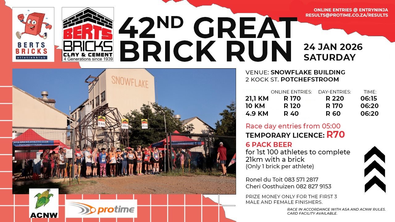 The 2026 Berts Bricks Great Brick Run will take place 24 Jan 2026 from 06h15 at the Snowflake Building, 2 Kock Street in Potchefstroom, North West. Distances available include 21km, 10km and 4.9km races.