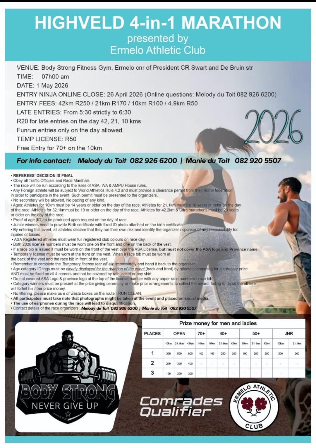 The 2026 Highveld 4-in-1 Marathon will take place Friday, 1 May 2026 from 07h00 at the Body Strong Fitness Gym, 31 President CR Swart St in Ermelo, Mpumalanga. Distances available include 42.2km, 21.1km, 10km and 4.9km races
