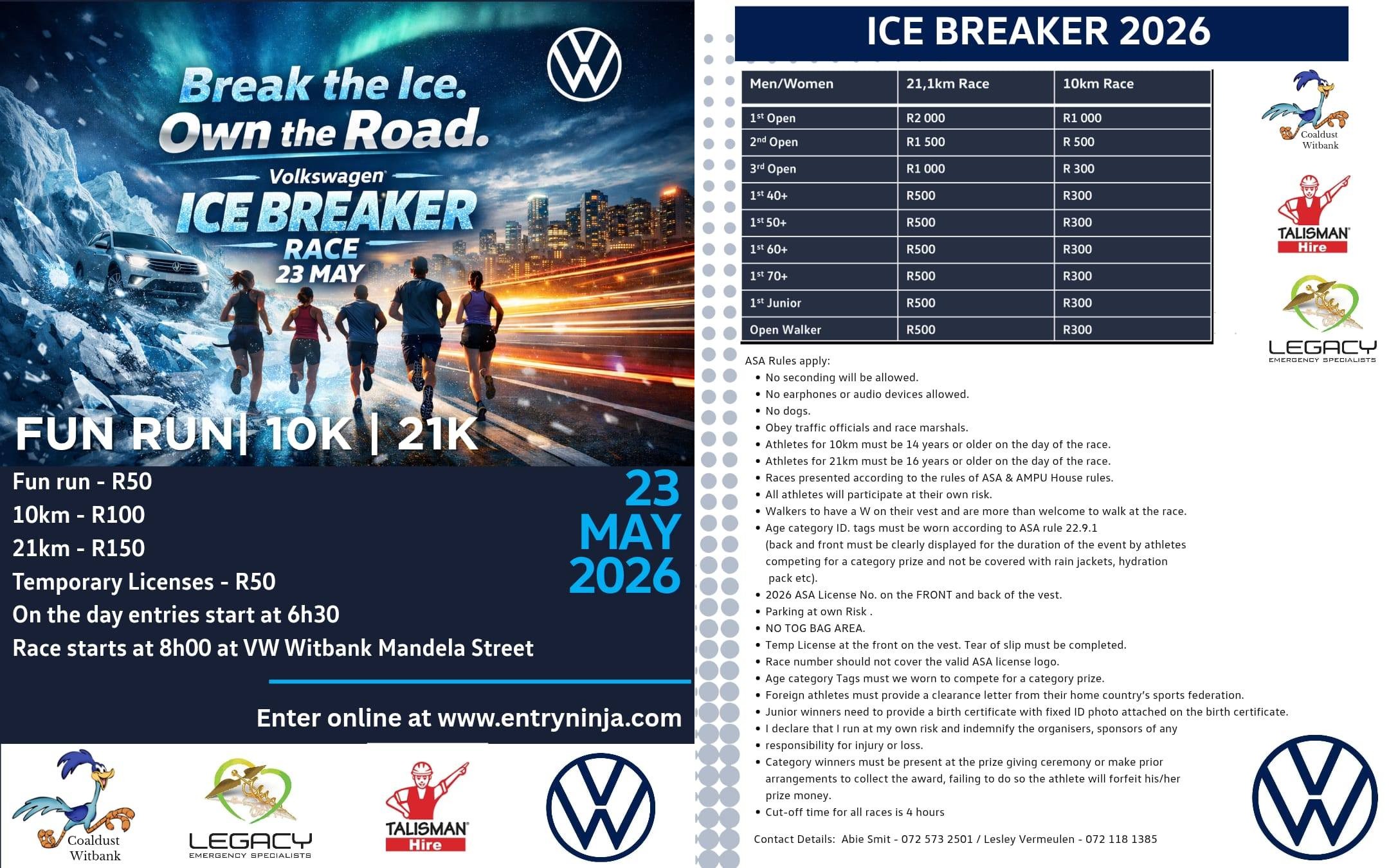 The 2026 McCarthy VW Witbank Ice Breaker Race will take place Saturday, 23 May 2026 from 08h00 at the McCarthy VW Witbank, Mandela St in eMalahleni, Mpumalanga. Distances available include 21.1km, 10km and 4.9km races.