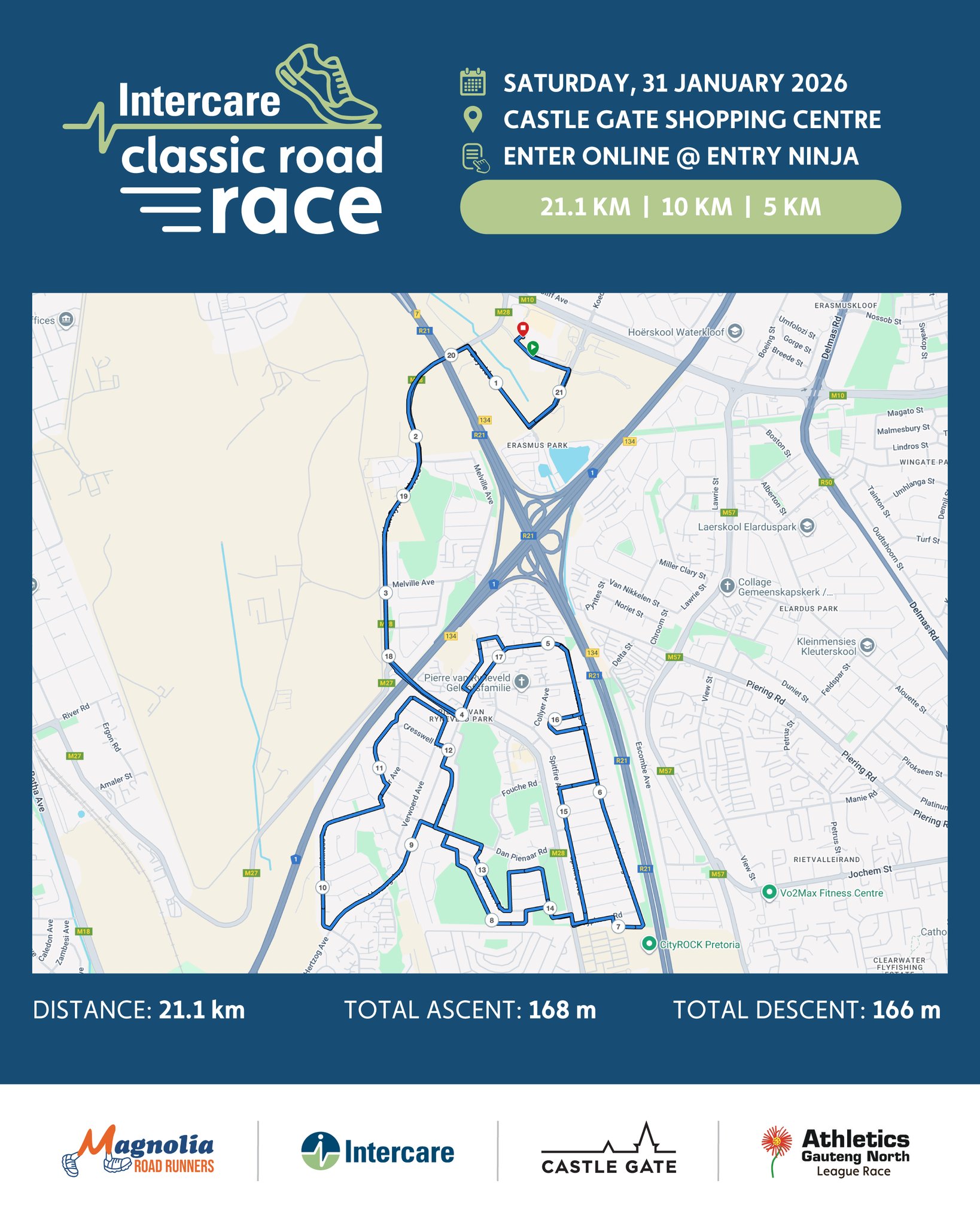 The 2026 Intercare Classic Road Race will take place Saturday, 31 January 2026 from 06h00 at the Castle Gate Shopping Centre, Waterkloof Ridge in Pretoria, Gauteng. Distances available include 21.1km, 10km and 5km races.