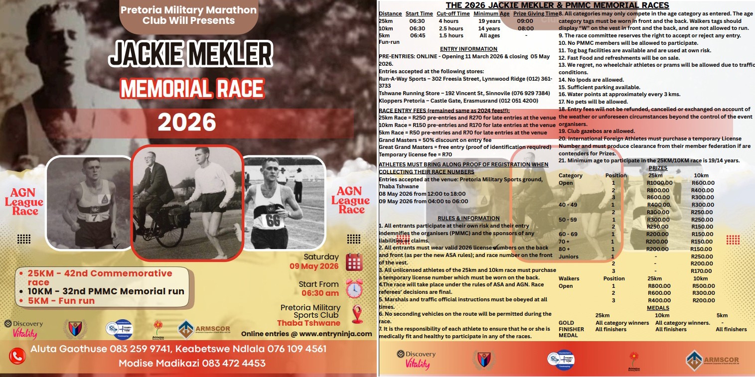 The 2026 Jackie Mekler Memorial Race will take place Saturday, 9 May 2026 from 06h30 at the Defence Sports Grounds Thaba Tshwane in Pretoria, Gauteng. Distances available include 25km, 10km and 5km races.
