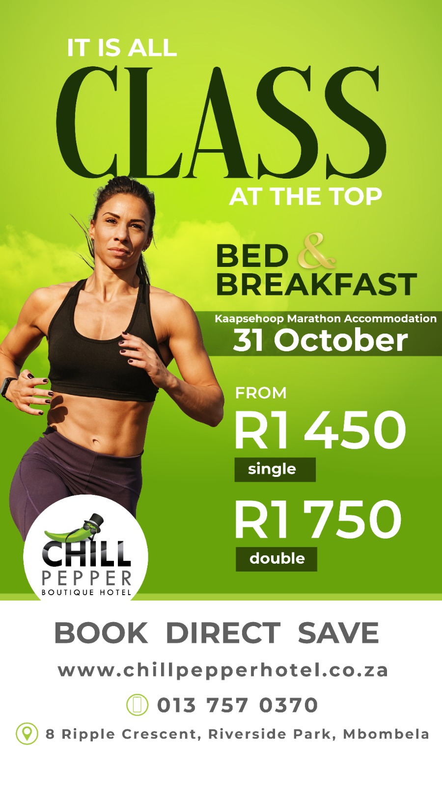 The 2025 Kaapsehoop 3-in-1 Marathon will take place 1 Nov 2025 from 05h30 starting at Kaapsehoop, Nelspruit Road and finishing at Mbombela Stadium in Mbombela, Mpumalanga. Distances available include 42.2km, 21.1km and 10km races.