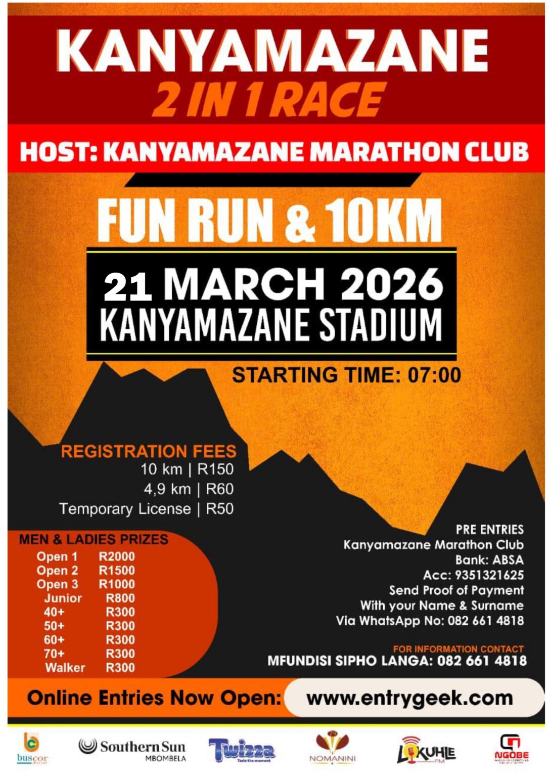 The 2026 kaNyamazane 2-in-1 Race will take place 21 Mar 2026 from 07h00 at the KaNyamazane Stadium, Sunbird St in KaNyamazane, Mpumalanga. Distances available include 10km and 4.9km races.