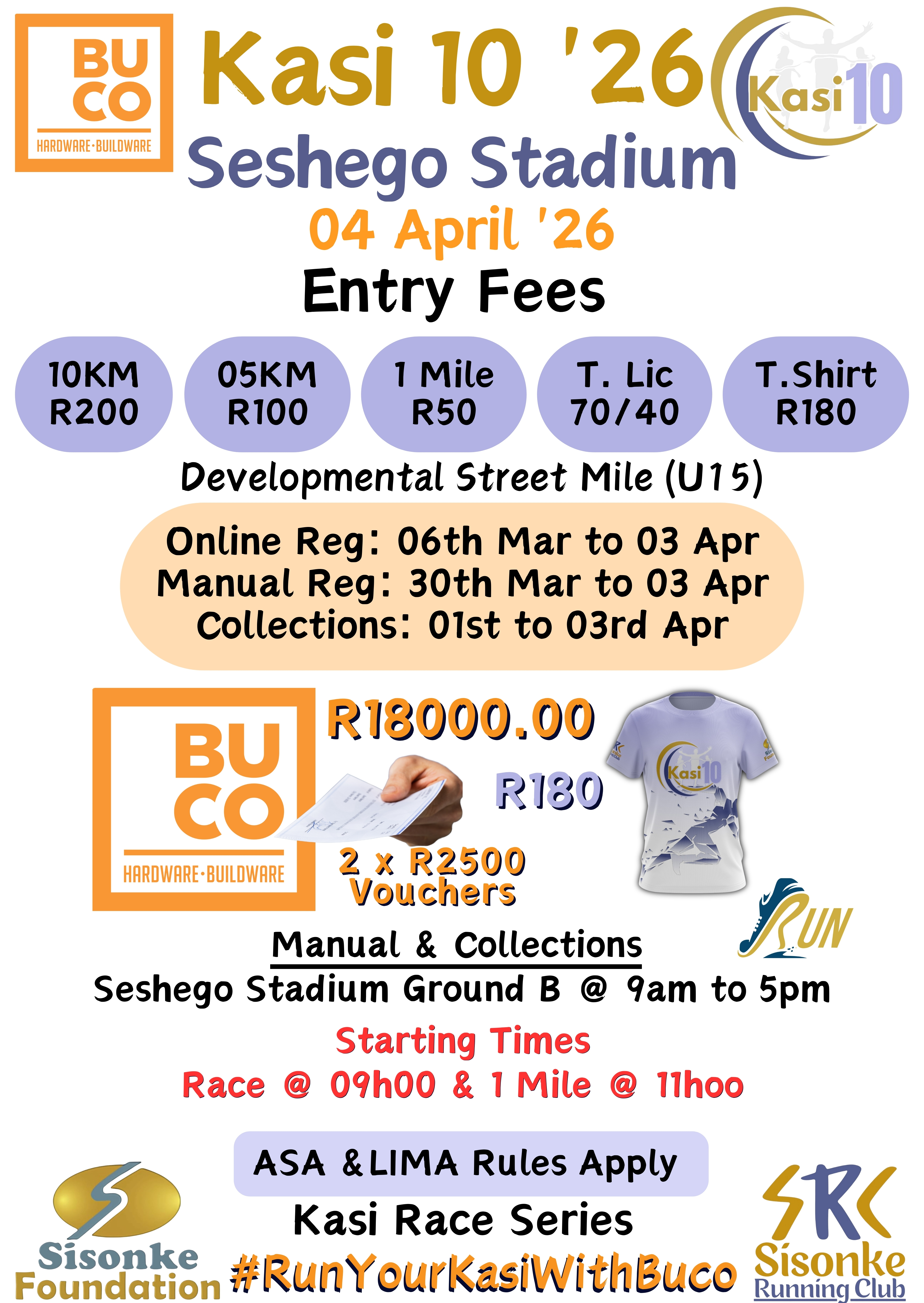 The 2026 Kasi 10 Race will take place Saturday, 4 April 2026 from 09h00 at the Seshego Stadium, Seshego in Polokwane, Limpopo. Distances available include 10km, 5km and 1.6km races