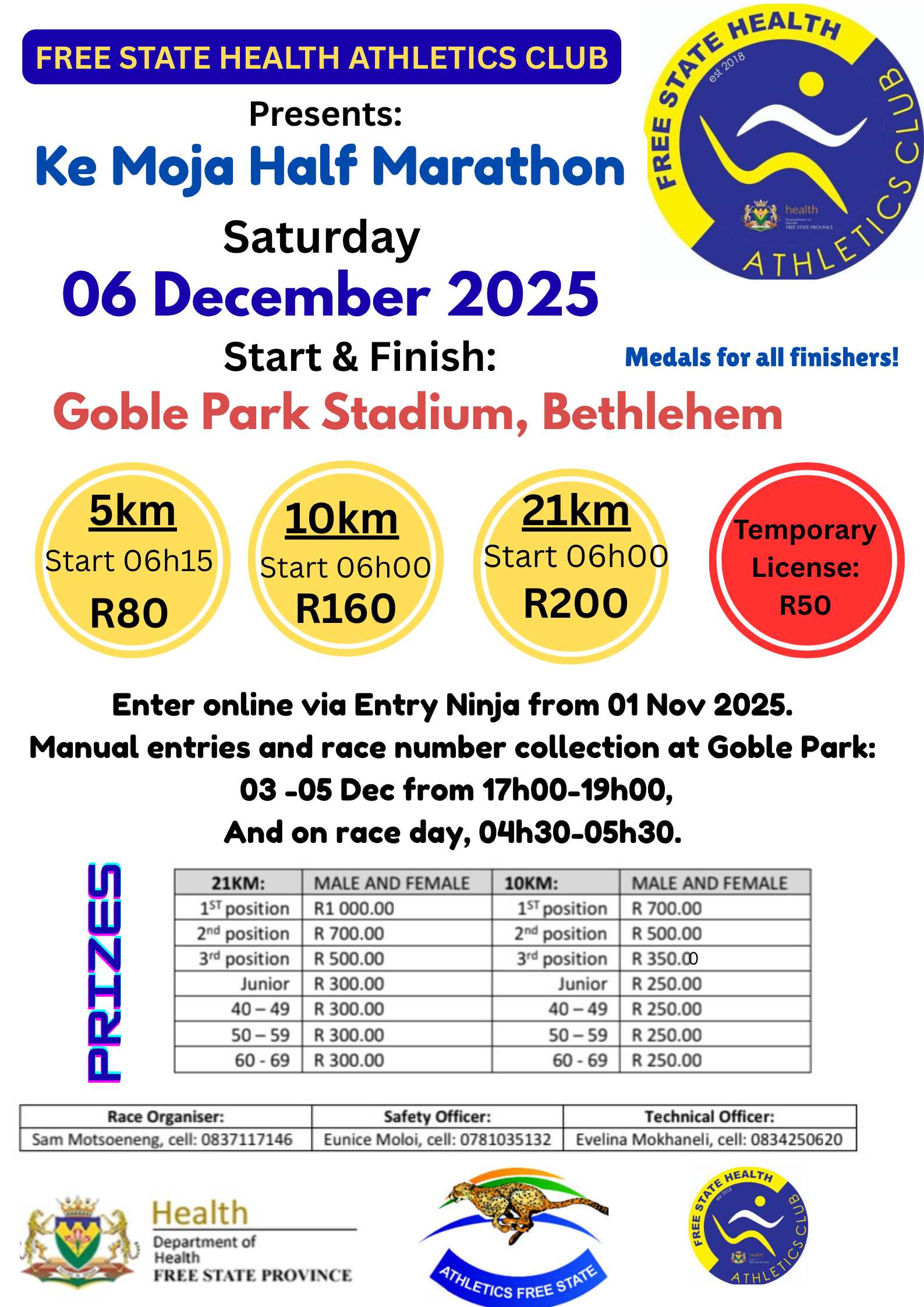 The 2025 Ke Moja Half Marathon will take place 6 Dec 2025 from 06h00 at the Goble Park Stadium in Bethlehem, Free State. Distances available include 21.1km, 10km and 5km races.