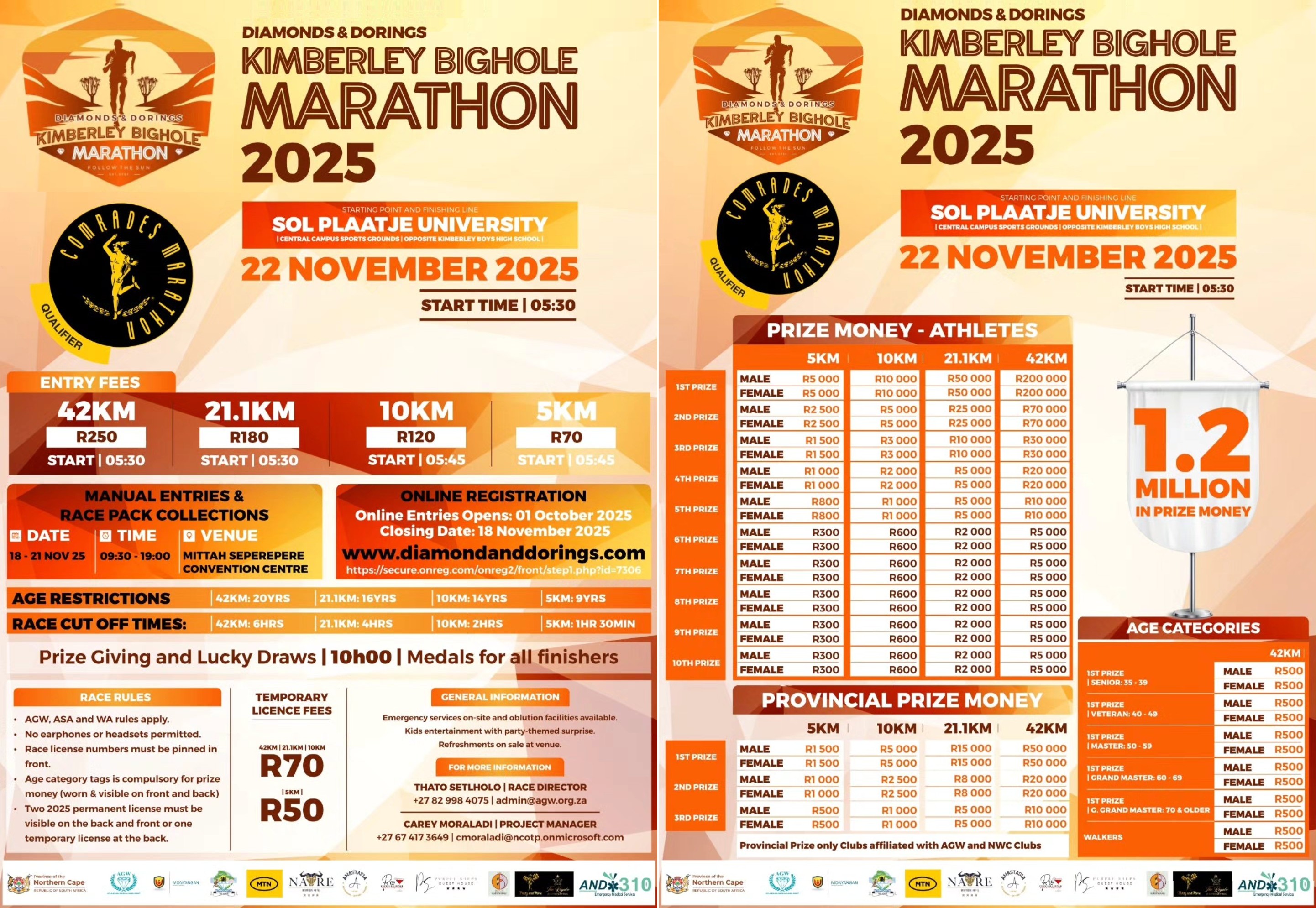 The 2025 Diamonds & Dorings Kimberley Bighole Marathon will take place 22 Nov 2025 from 05h30 at the Sol Plaatjie University Sports Grounds in Kimberley, Northern Cape. Distances available include 42.2km, 21.1km, 10km and 5km races.