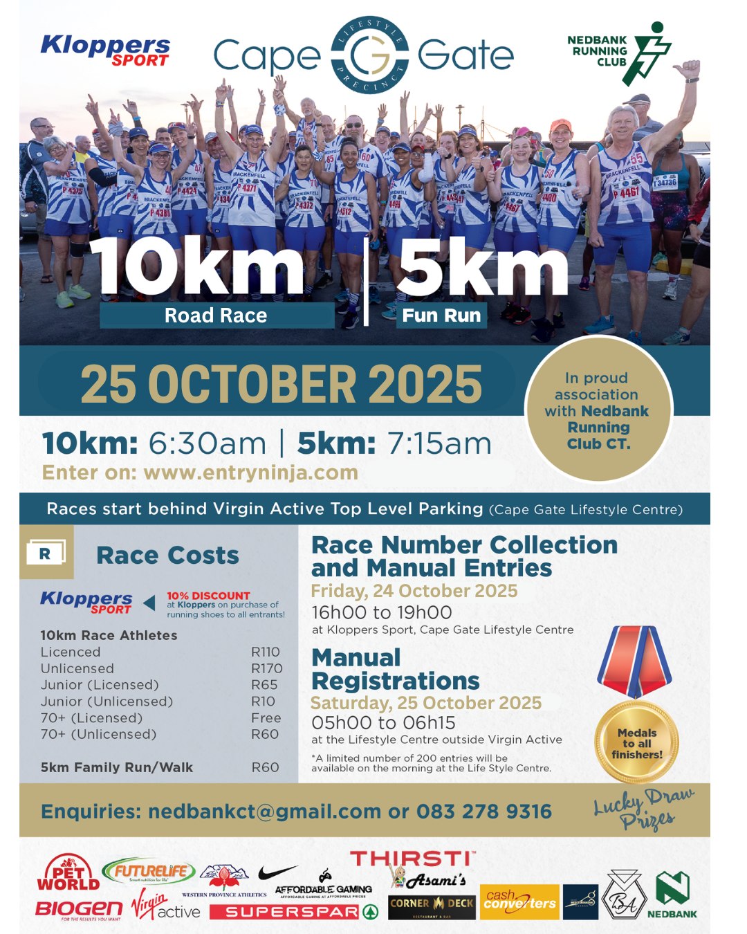 Event ran 3 days agoThe 2025 Kloppers Sport 10km Race took place 25 Oct 2025 from 06h30 starting at Virgin Active Top Level Parking, Cape Gate Lifestyle Centre and finishing at Cape Gate Lifestyle Centre in Brackenfell, Western Cape. Distances included a 10km and 5km races.