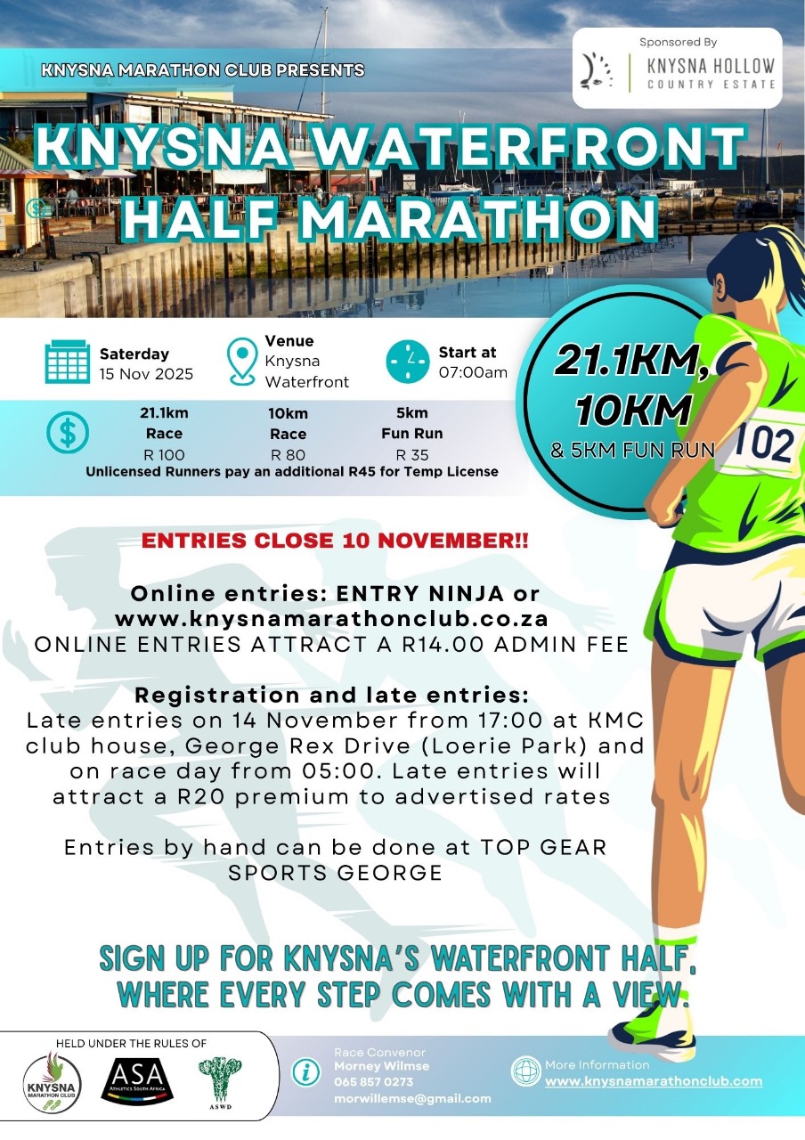 The 2025 Knysna Waterfront Half Marathon will take place 15 Nov 2025 from 07h00 at the Knysna Waterfront in Knysna, Western Cape. Distances available include 21.1km, 10km and 5km races.