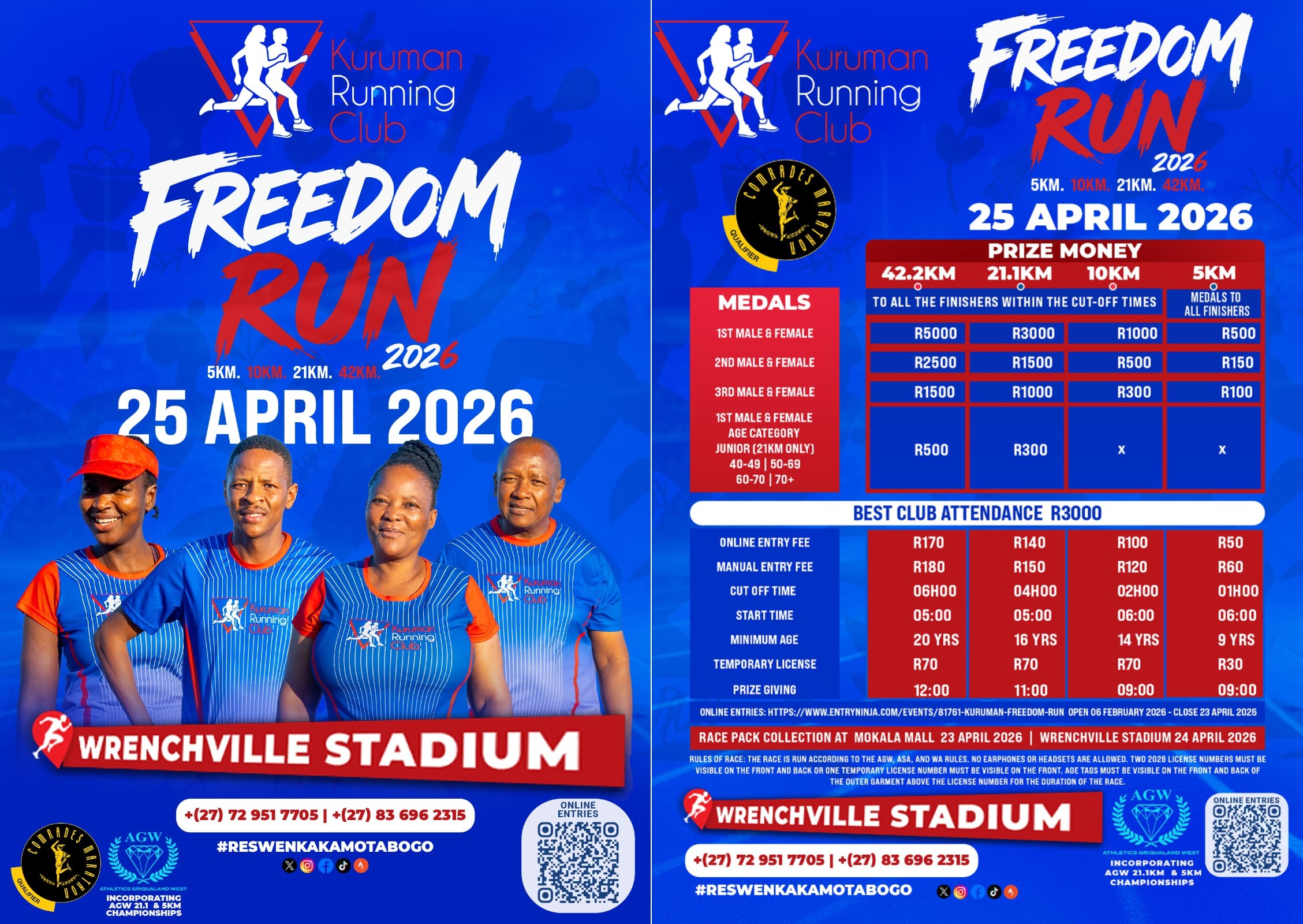 The 2026 Kuruman Running Club Freedom Run will take place Saturday, 25 April 2026 from 05h00 at the Wrenchville Stadium in Kuruman, Northern Cape. Distances available include 42.2km, 21.1km, 10km and 5km races.