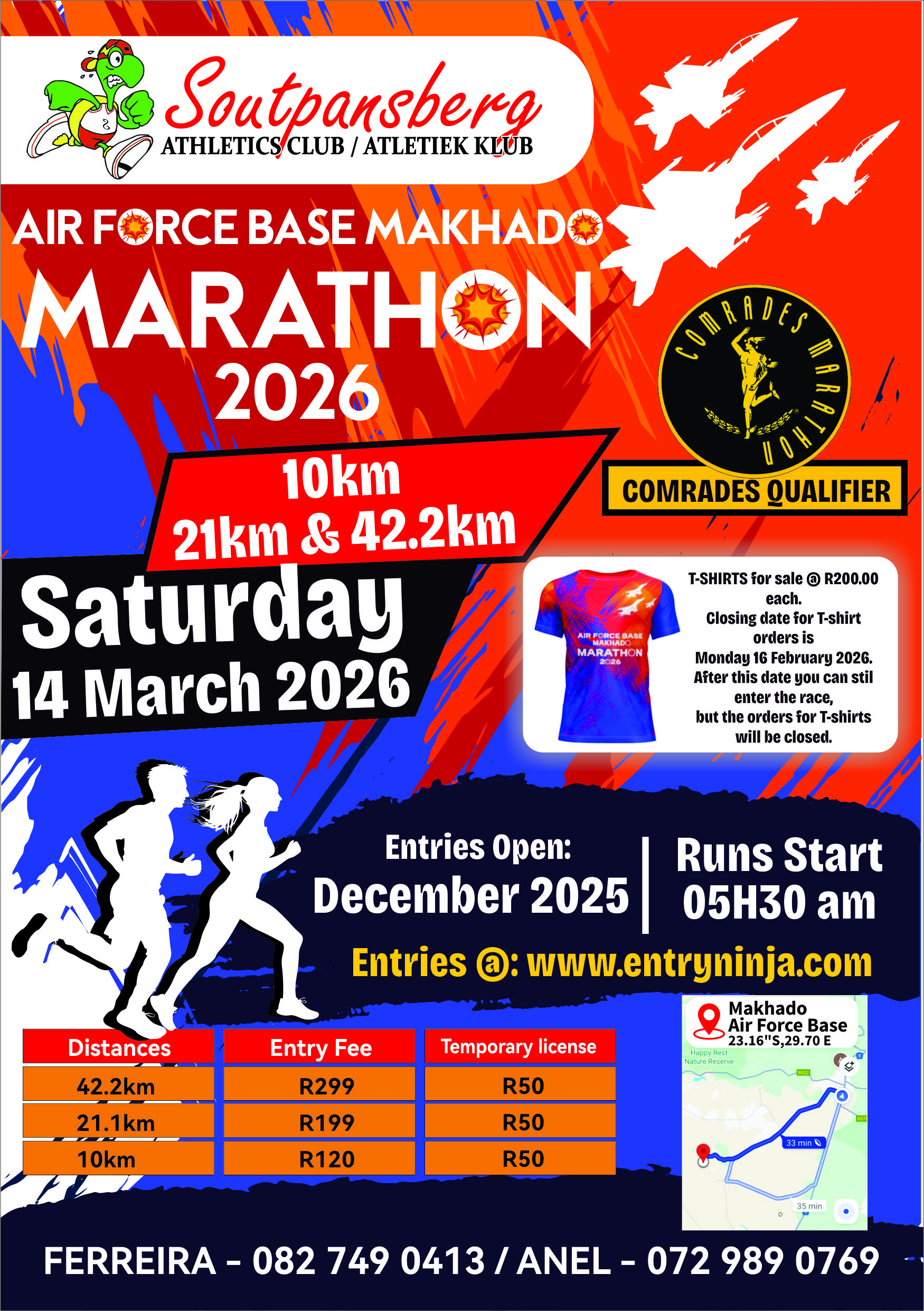 The 2026 Makhado Airforce Bace Marathon will take place Saturday, 14 March 2026 from 05h30 at the Makhado Air Force Base in Louis Trichardt, Limpopo. Distances available include 42.2km, 21.1km, 10km and 5km races.