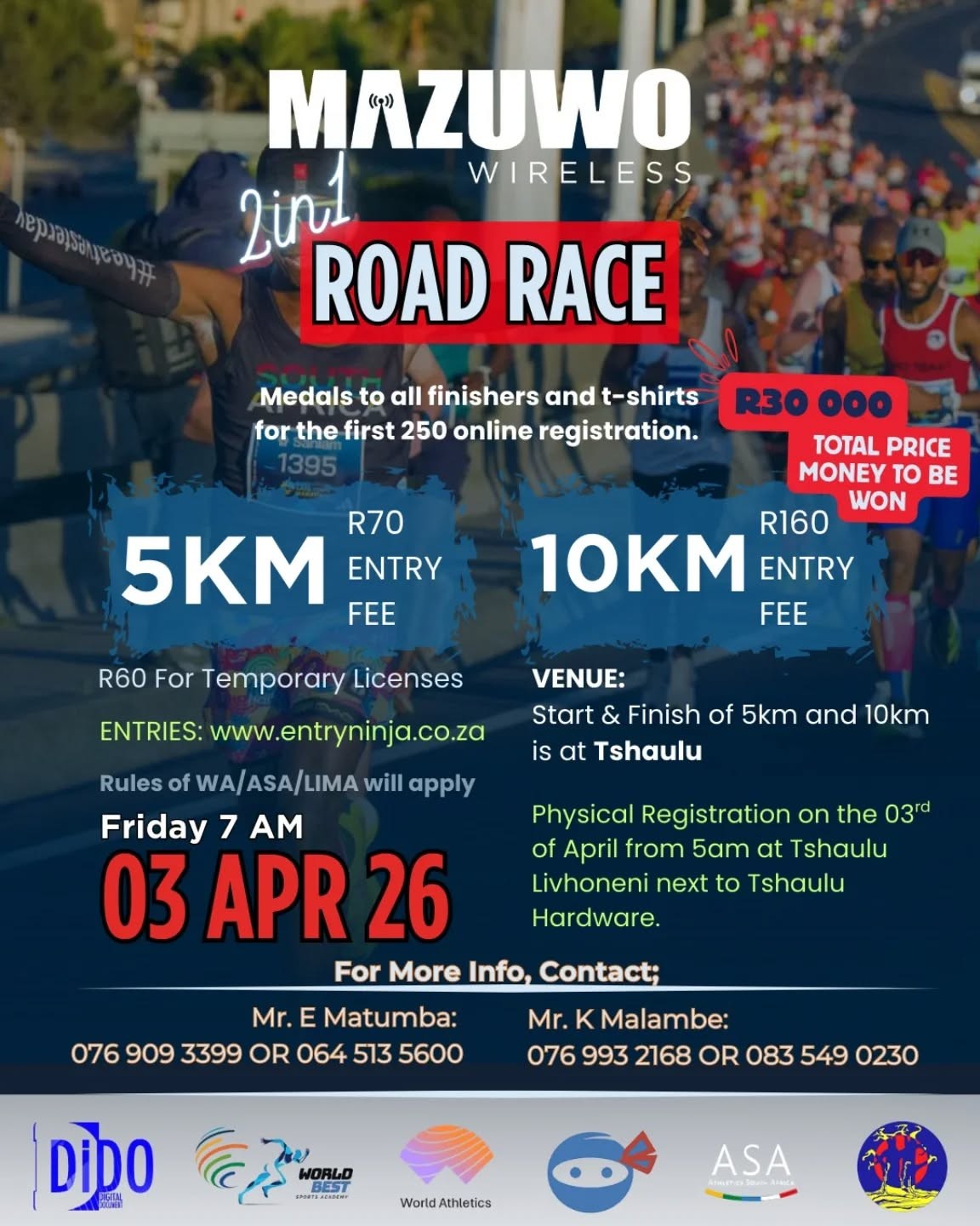 The 2026 Mazuwo Wireless Road Race will take place Friday, 3 April 2026 from 07h00 at the Tshaulu in Tshaulu, Limpopo. Distances available include 10km and 5km races.