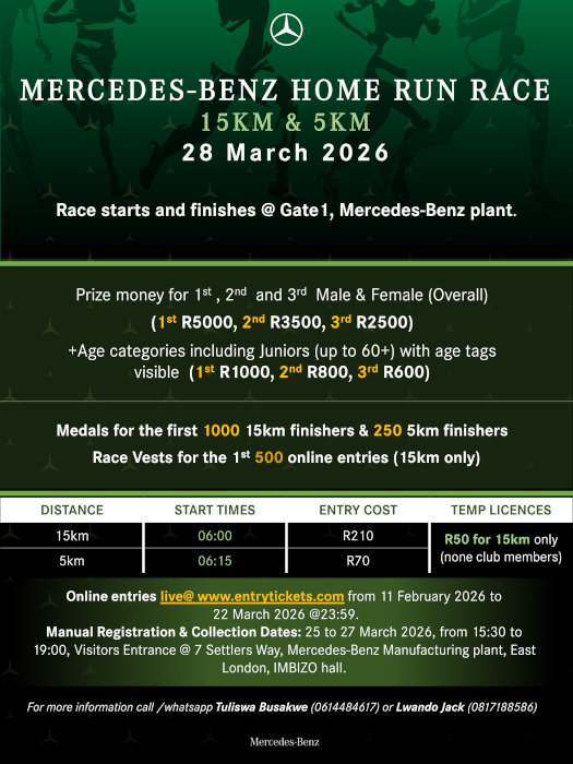 The 2026 Mercedes Benz 15km Home Run will take place Saturday, 28 March 2026 from 06h00 at the Visitors Entrance @ Mercedes Benz, 7 Settlers Way in East London, Eastern Cape. Distances available include 15km and 5km races.