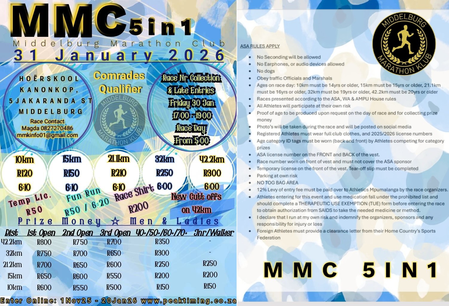 The 2026 MMC 5-in-1 Race will take place 31 Jan 2026 from 06h00 at the Hoërskool Kanonkop, 5 Jakaranda St, Kanonkop in Middelburg, Mpumalanga. Distances available include 42.2km, 32km, 21.1km, 15km, 10km and 4.9km races.