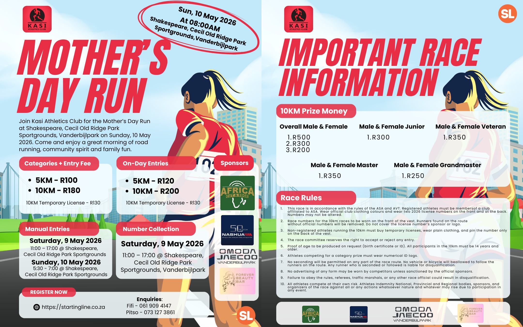 The 2026 Mother's Day Run will take place Sunday, 10 May 2026 from 08h00 at the Shakespeare Stadium, Cecil Old Ridge Park Sportsgrounds in Vanderbijlpark, Gauteng. Distances available include 10km and 5km races.