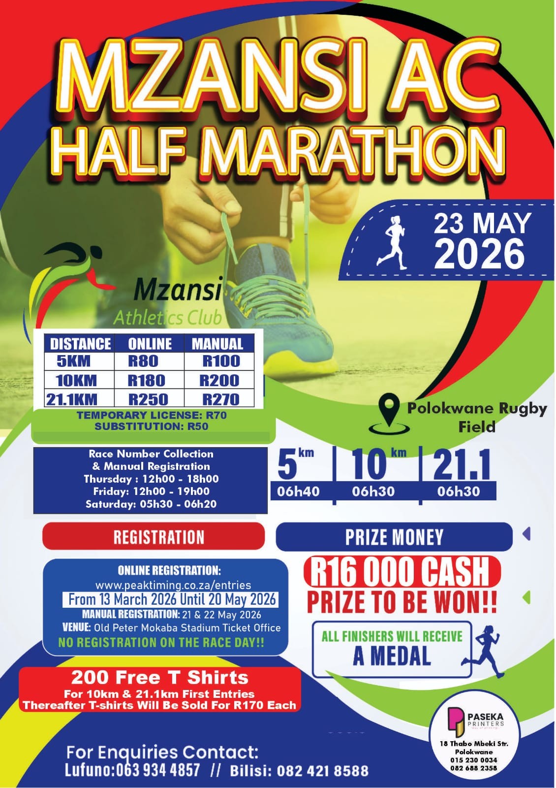 The 2026 Mzansi AC Half-Marathon will take place Saturday, 23 May 2026 from 06h30 at the Polokwane Rugby Field in Polokwane, Limpopo. Distances available include 21.1km, 10km and 5km races.