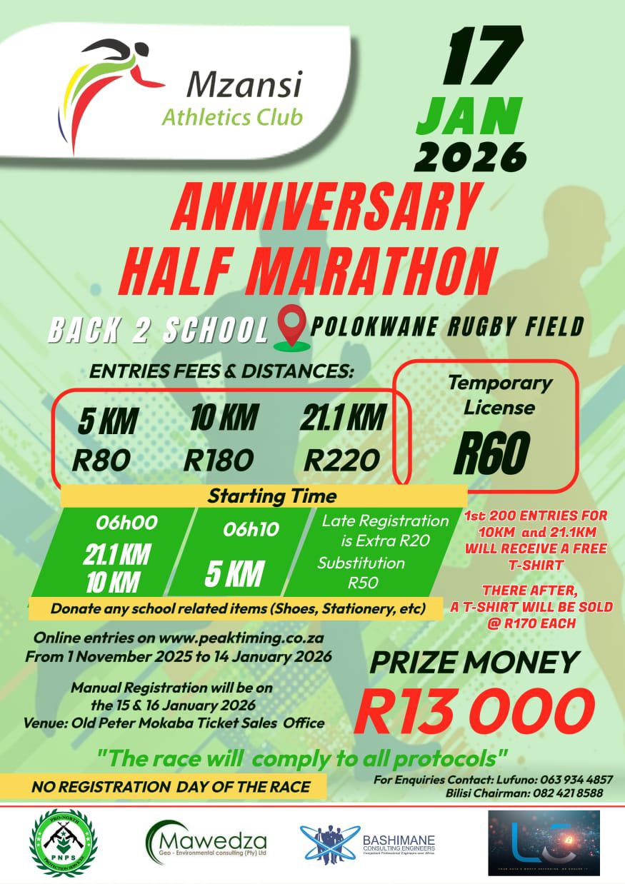 The 2026 Mzansi AC Anniversary Half-Marathon Back2School will take place Saturday, 17 January 2026 from 06h00 at the Old Peter Mokaba Stadium in Polokwane, Limpopo. Distances available include 21.1km, 10km and 5km races.