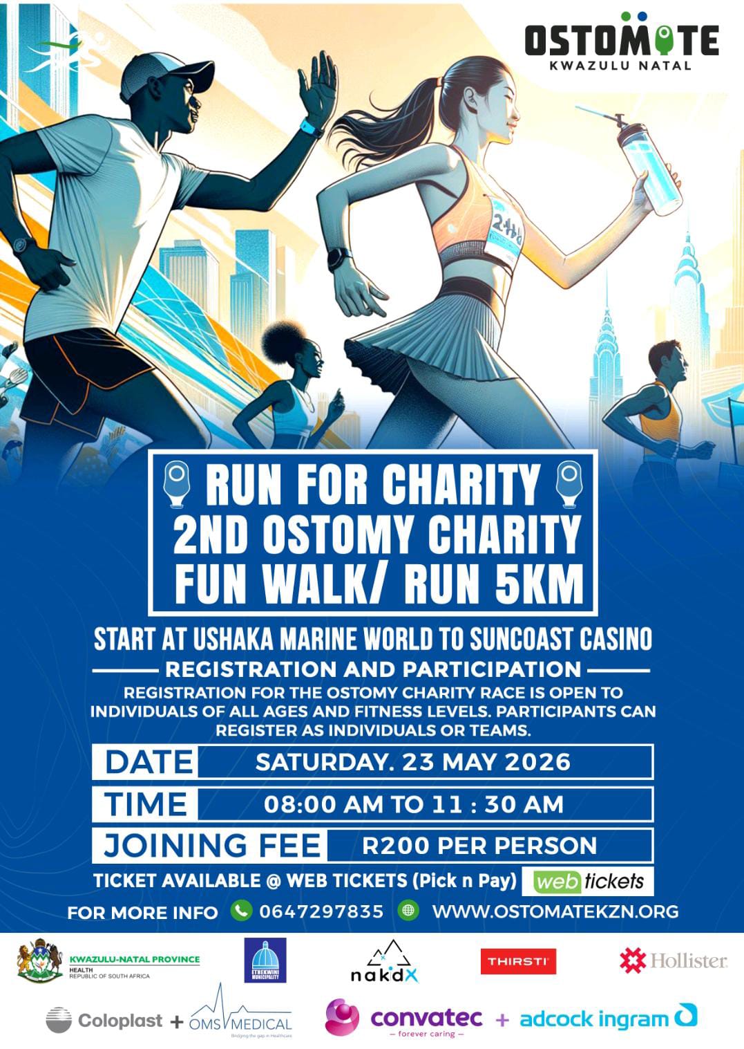 The 2026 Ostomy Charity fun Walk/Run will take place Saturday, 23 May 2026 from 08h00 starting at uShaka Marine World, King Shaka Avenue and finishing at Suncoast Casino in Durban, KwaZulu Natal. Distance of the race is 5km.