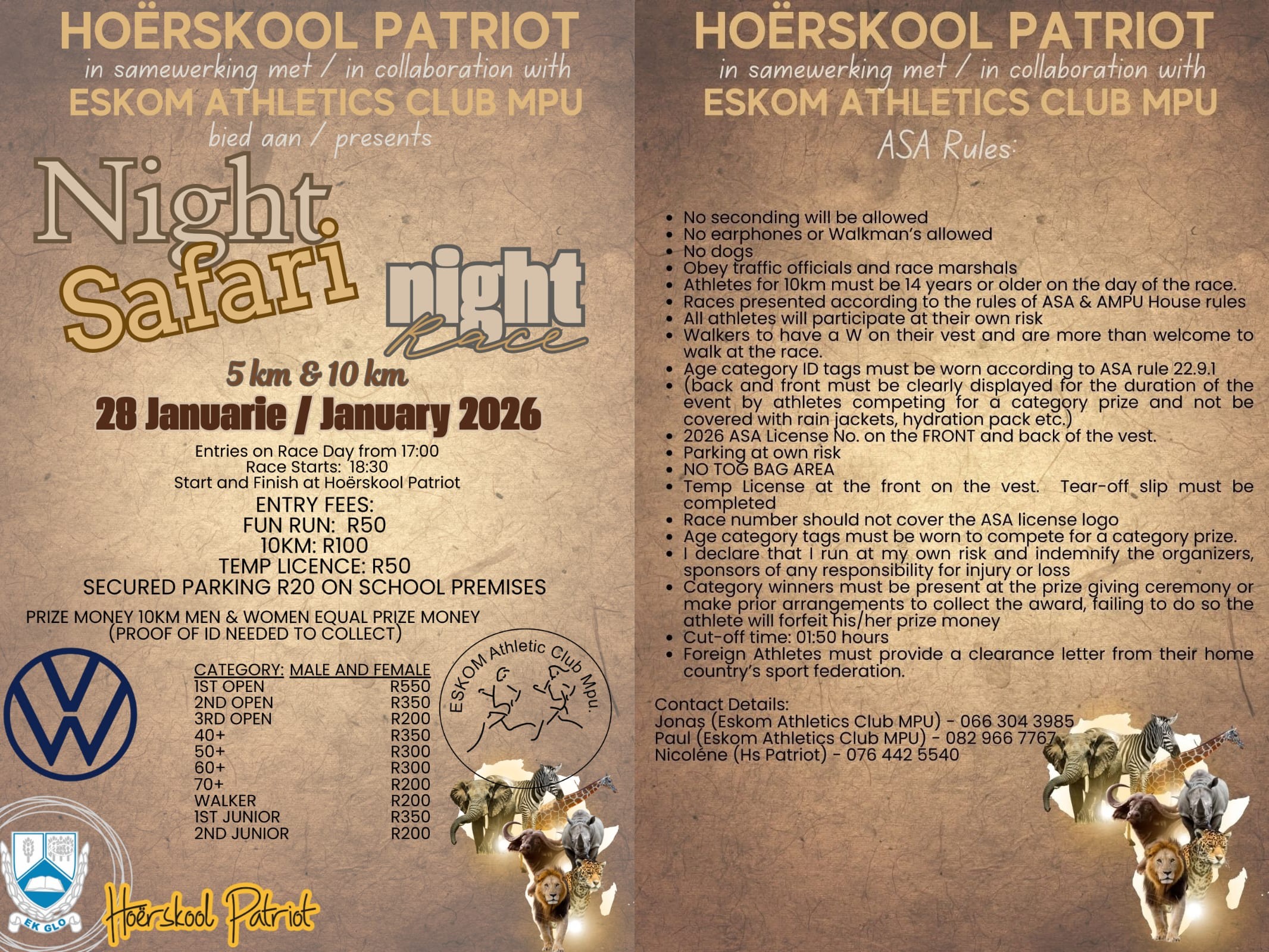 The 2026 Patriot High School Safari Night Race will take place Wednesday, 28 January 2026 from 18h30 at the Hoërskool Patriot in eMalahleni, Mpumalanga. Distances available include 10km and 5km races.
