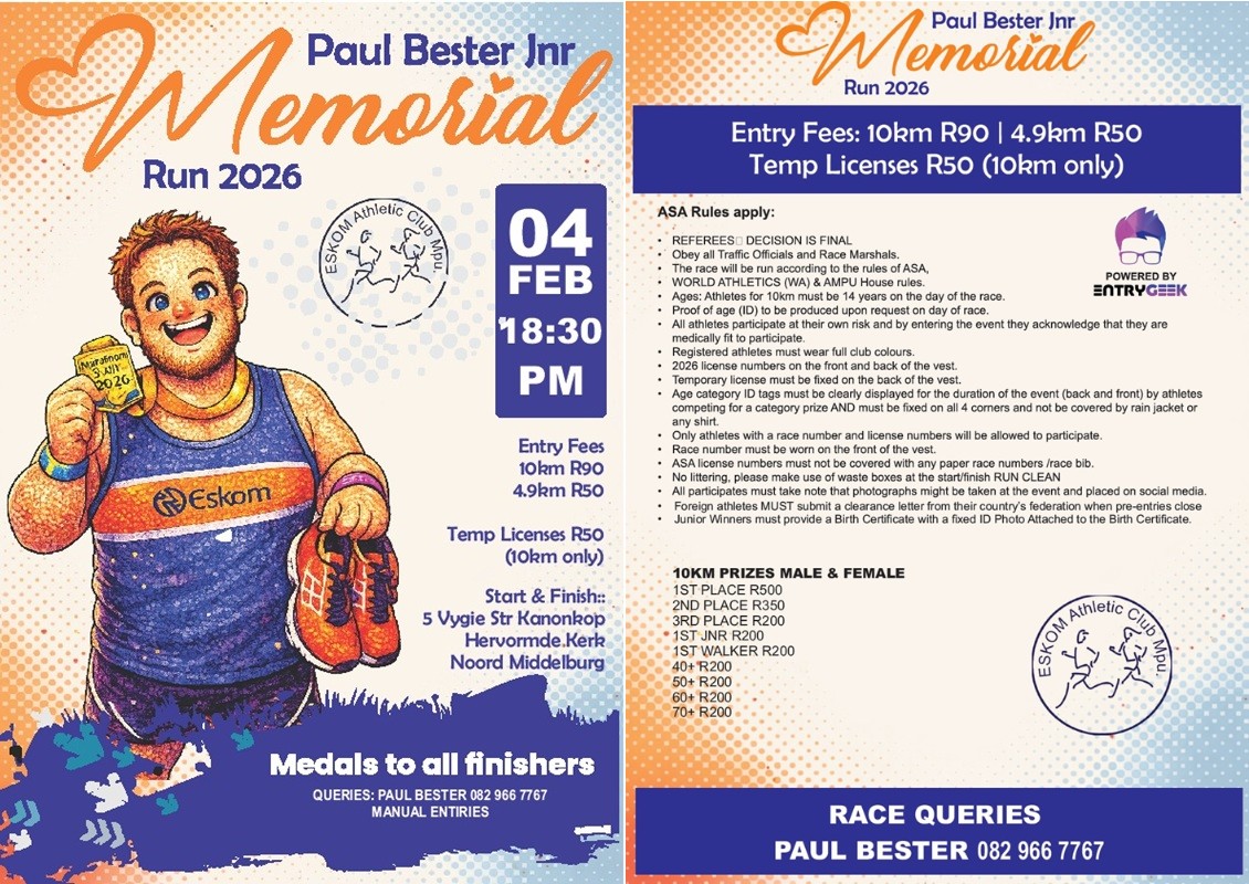 The 2026 Paul Bester Jr Memorial will take place Wednesday, 4 February 2026 from 18h30 at the Hervormde Kerk, Kanonkop in Middelburg, Mpumalanga. Distances available include 10km and 4.9km races.