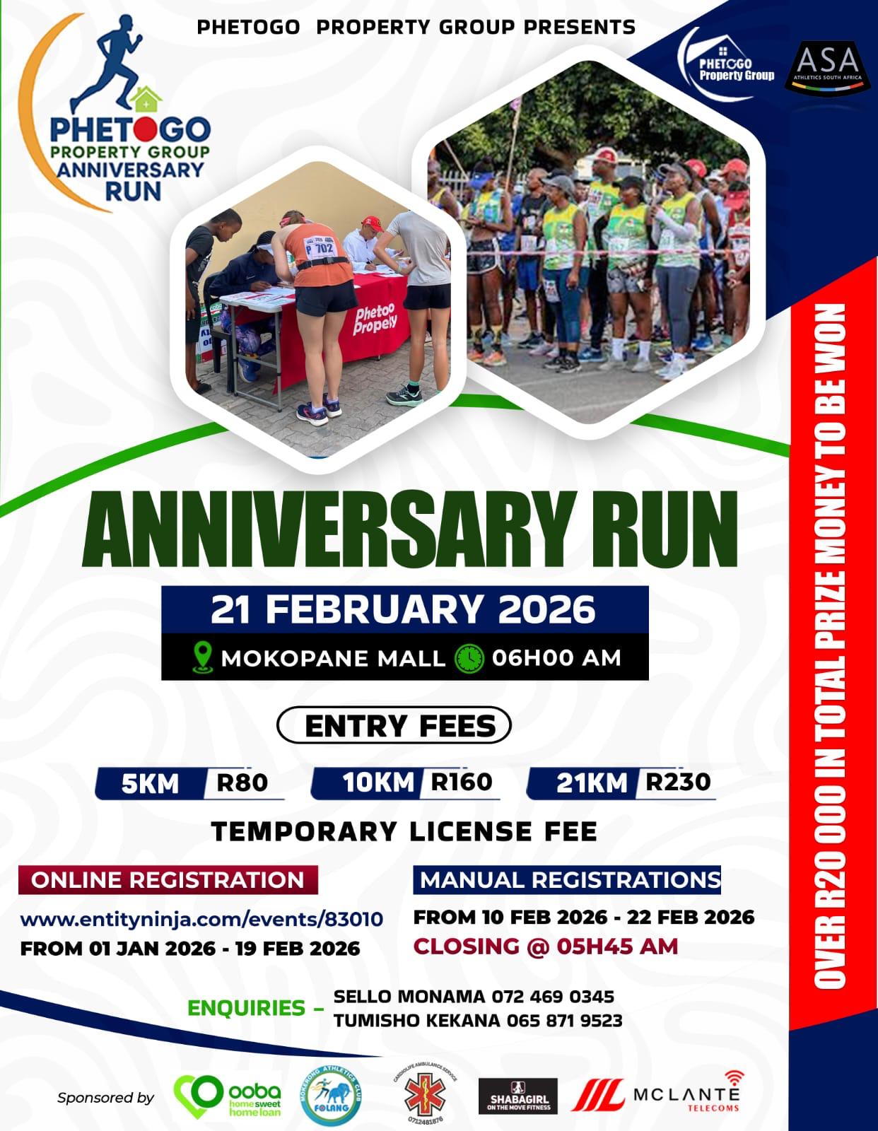 The 2026 Phetogo Property Anniversary Run will take place Saturday, 21 February 2026 from 06h30 at the Mokopane Mall, Thabo Mbeki Dr in Mokopane, Limpopo. Distances available include 21.1km, 10km and 5km races.
