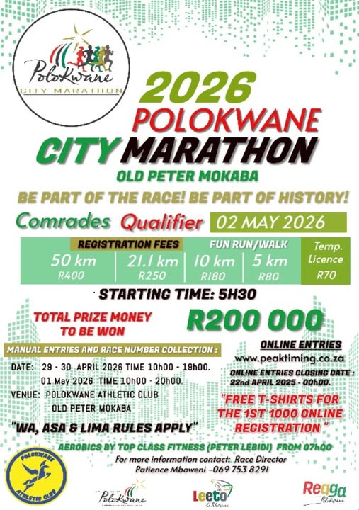 The 2026 Polokwane City Marathon will take place 2 May 2026 from 05h30 at the Old Peter Mokaba Stadium in Polokwane, Limpopo. Distances available include 50km, 21.1km, 10km and 5km races.