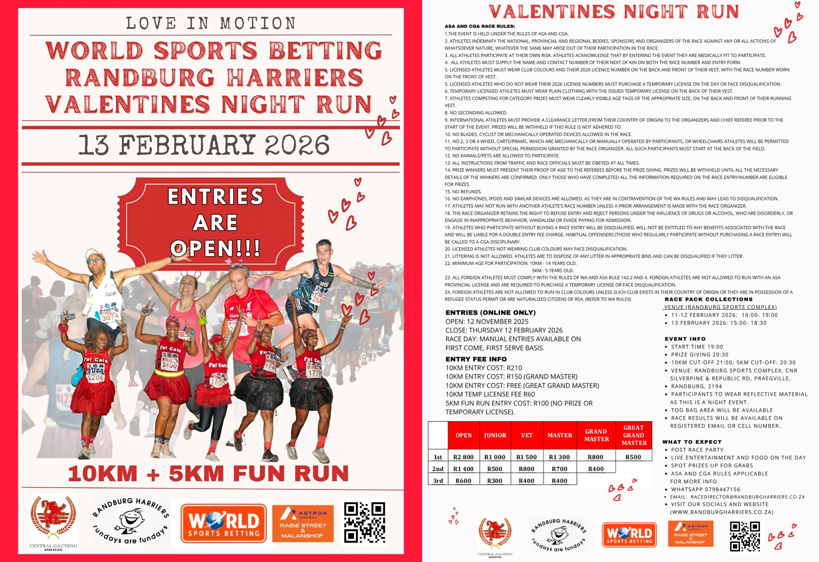 The 2026 Randburg Harriers Valentine 10km Race will take place 13 Feb 2026 from 19h00 at the Randburg Sports Complex, Randburg in Johannesburg, Gauteng. Distances available include 10km and 5km races.