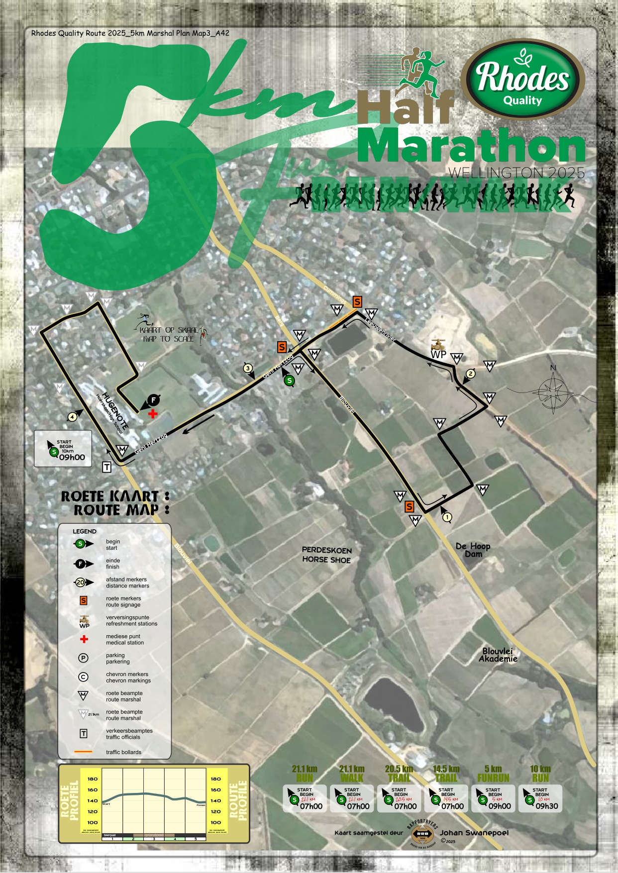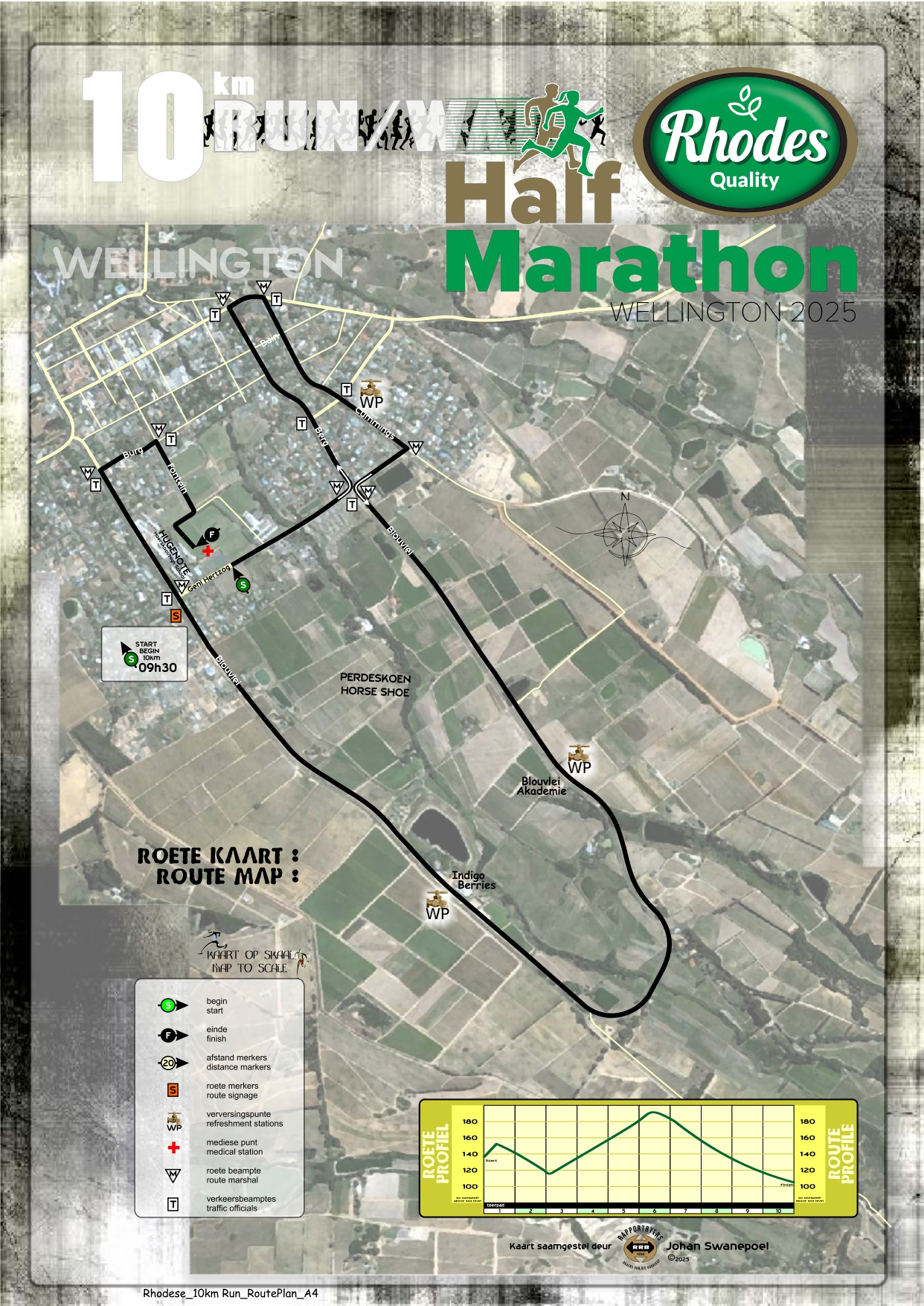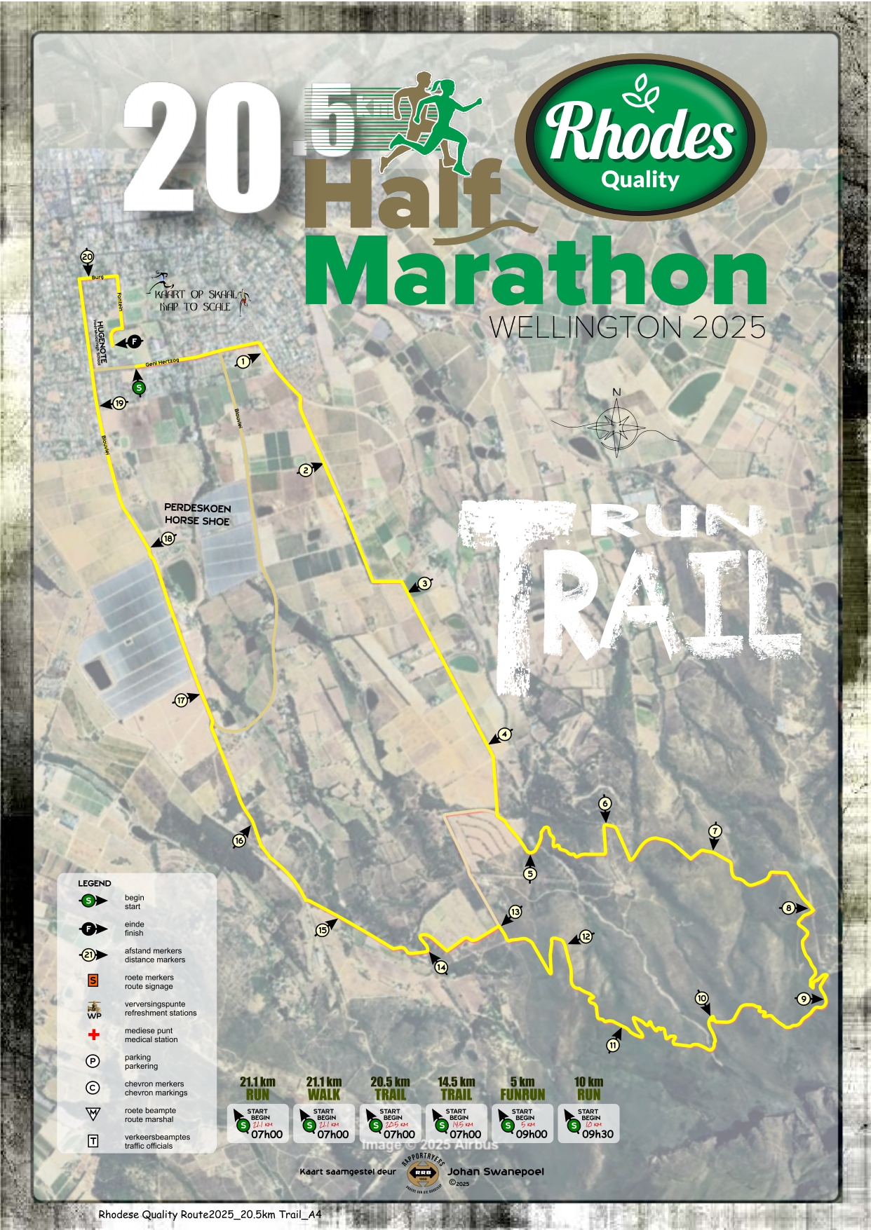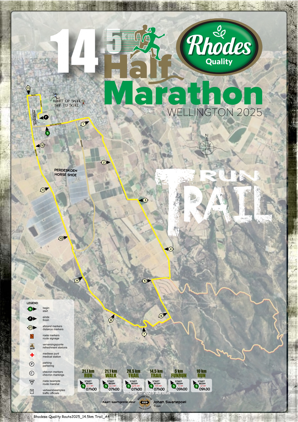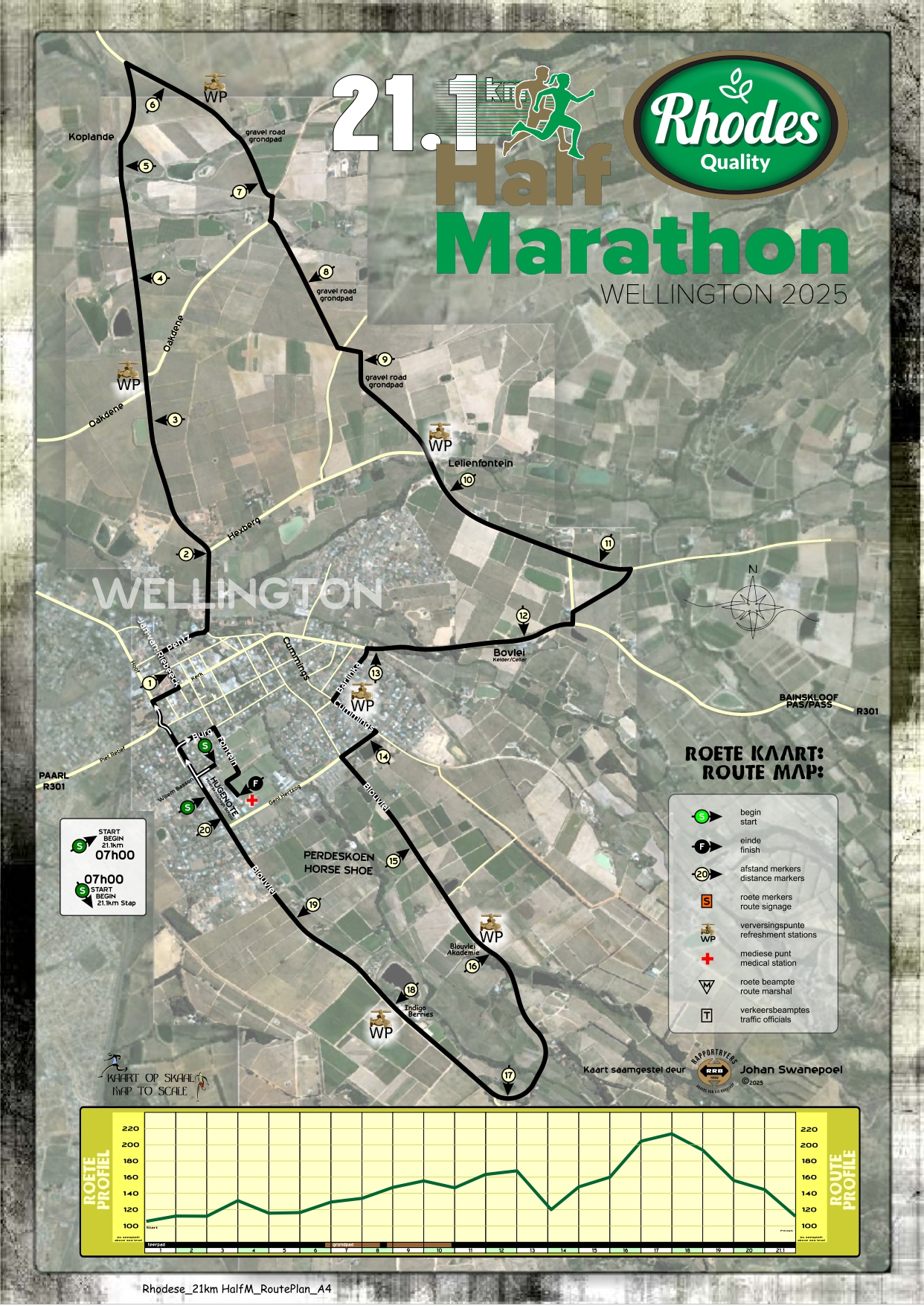 The 2026 Rhodes Quality Half-Marathon will take place 1 May 2026 from 07h00 at the Hugenote High School in Wellington, Western Cape. Distances available include 21.1km, 21.1km, 20.5km, 14.5km, 10km and 5km races.