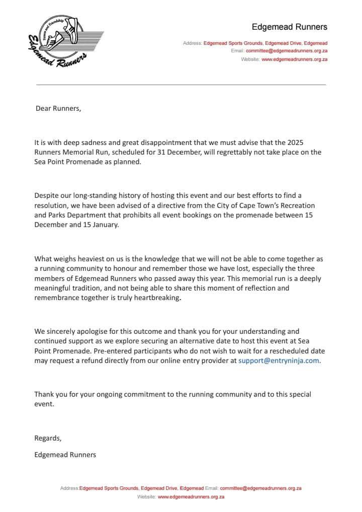 This event was not heldThe 2025 Runners Memorial Race which was scheduled to take place Wednesday, 31 December 2025 was cancelled.