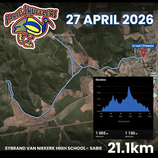The 2026 Sabie Shufflers 3-in-1 will take place Monday, 27 April 2026 from 07h00 at the Sybrand v Niekerk High School in Sabie, Mpumalanga. Distances available include 21.1km, 10km and 4.9km races.