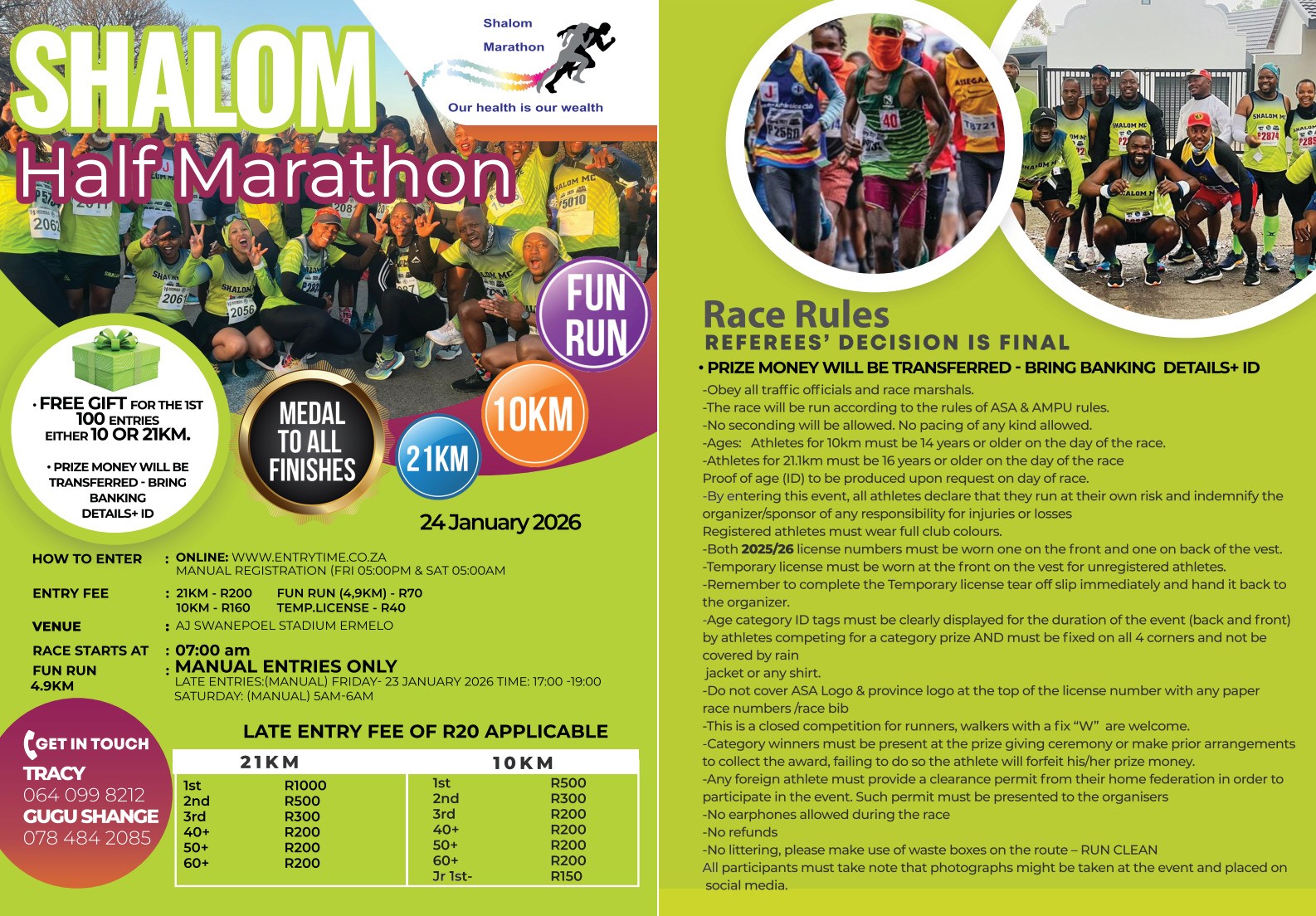 The 2026 Shalom Half-Marathon will take place 24 Jan 2026 from 07h00 at the AJ Swanepoel Stadium, Joubert St in Ermelo, Mpumalanga. Distances available include 21.1km, 10km and 4.9km races.