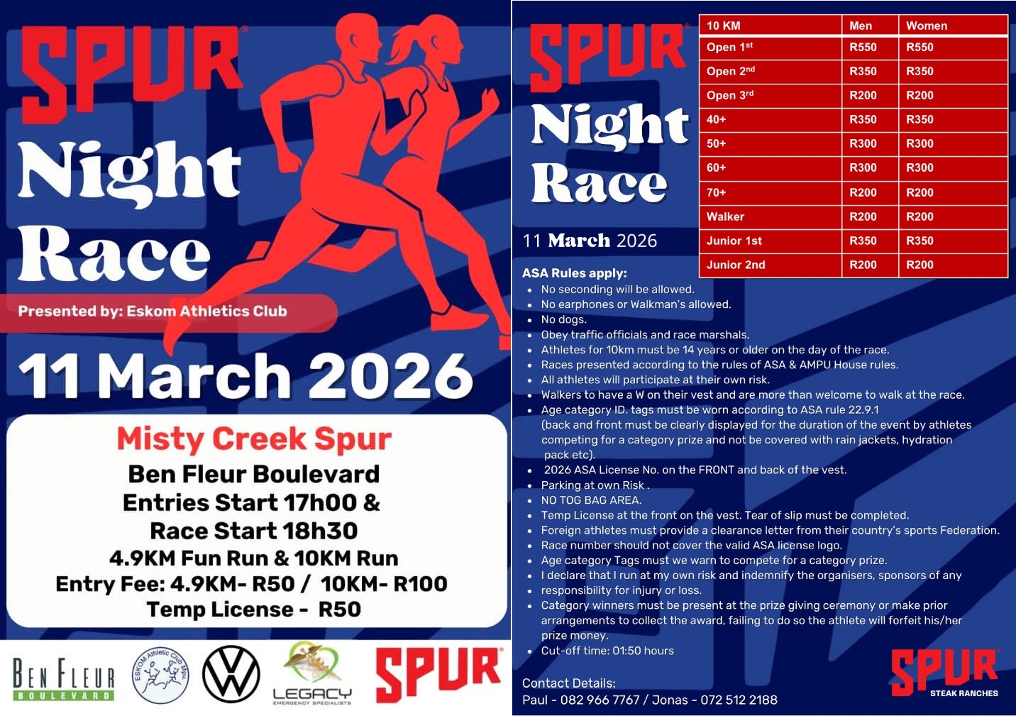 The 2026 SPUR Night Race will take place Wednesday, 11 March 2026 from 18h30 at the Misty Creek Spur Steak Ranch, Ben Fleur in eMalahleni, Mpumalanga. Distances available include 10km and 4.9km races.