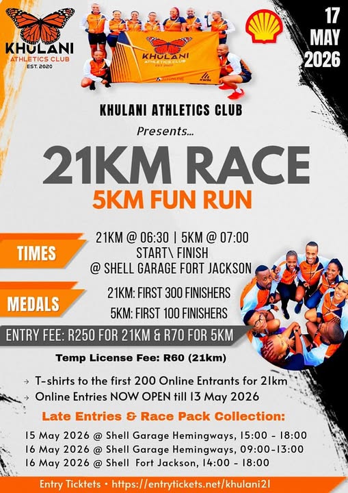 The 2026 Trail Grinder 21km will take place Sunday, 17 May 2026 from 06h30 at the Shell Garage, Fort Jackson, Mdantsane in East London, Eastern Cape. Distances available include 21.1km and 5km races.