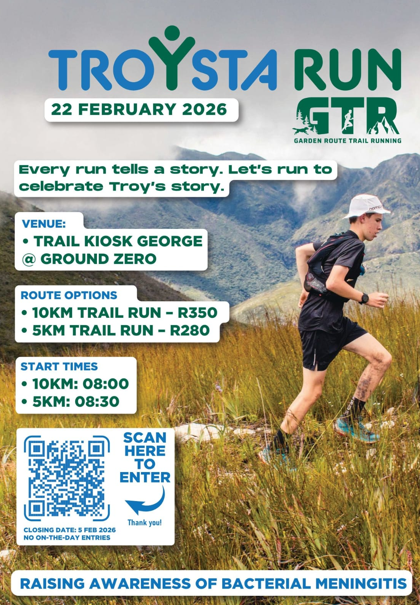 Join us to celebrate Troy’s story and raise awareness of Bacterial Meningitis. On 22 Feb 2026, we will host a GTR fundraising 10km Trail Run aka the Troysta, where all funds will go towards trail maintenance in our Outeniqua mountains.