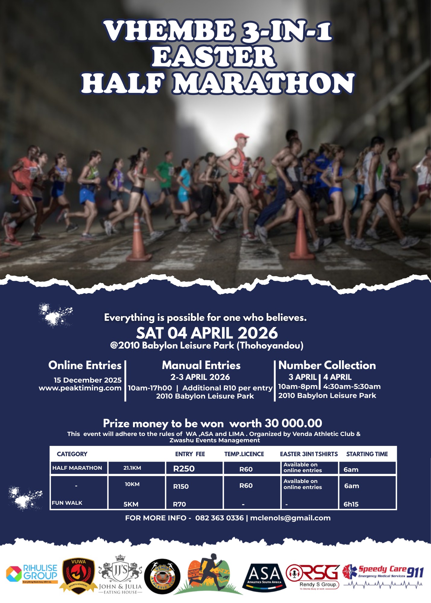 The 2026 Vhembe 3-in-1 Easter Half-Marathon will take place Saturday, 4 April 2026 from 06h00 at the Babylon Leisure Park in Thohoyandou, Limpopo. Distances available include 21.1km, 10km and 5km races.