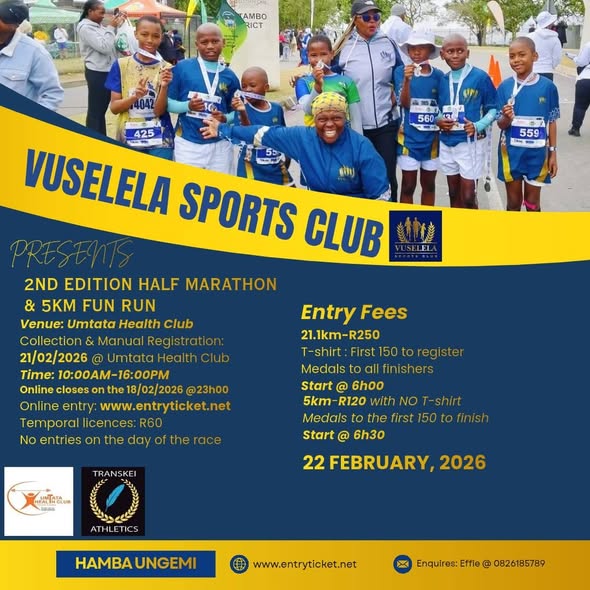 The 2026 Vuselela Half Marathon will take place Sunday, 22 February 2026 from 05h30 at the Umtata Health Club in Mthatha, Eastern Cape. Distances available include 21.1km and 5km races.